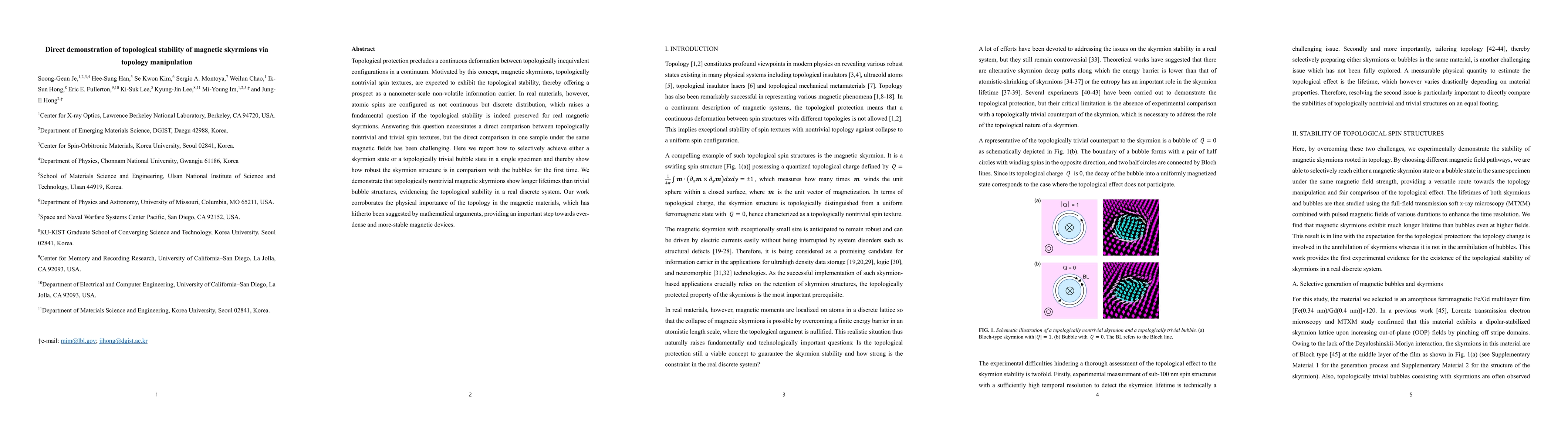 This paper demonstrates the topological stability of magnetic skyrmions in real materials by comparing their lifetimes with topologically trivial bubble states in a single specimen. The findings show that skyrmions have longer lifetimes, confirming their topological stability and supporting their potential as stable information carriers in magnetic devices.