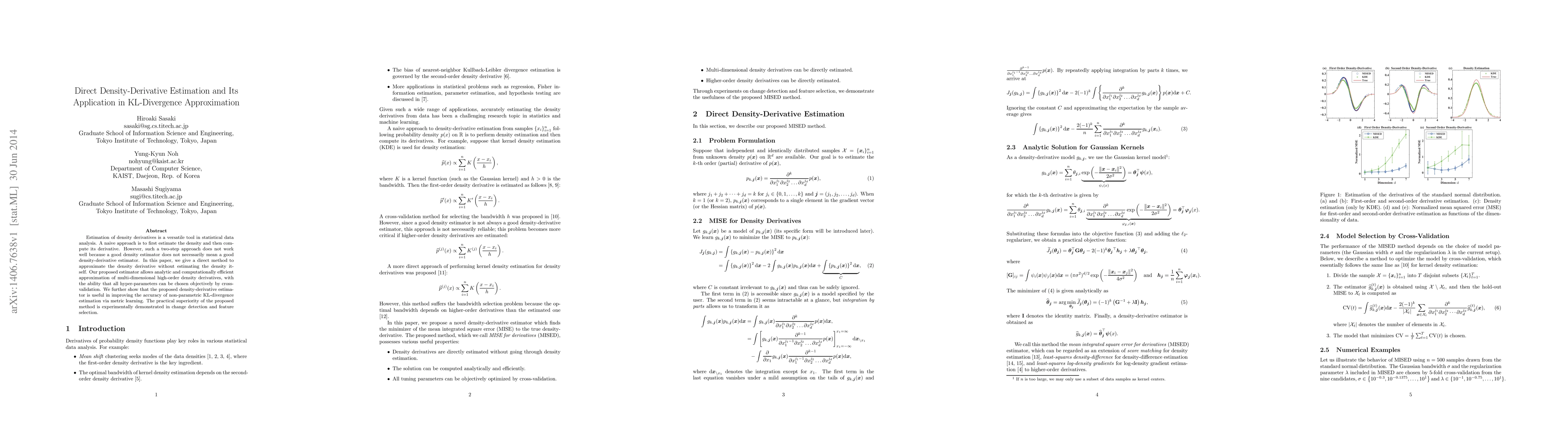 This paper proposes a direct method for estimating density derivatives without first estimating the density, which is more accurate than traditional two-step approaches. The method allows efficient computation of high-order derivatives and is shown to improve non-parametric KL-divergence estimation, demonstrated through applications in change detection and feature selection.