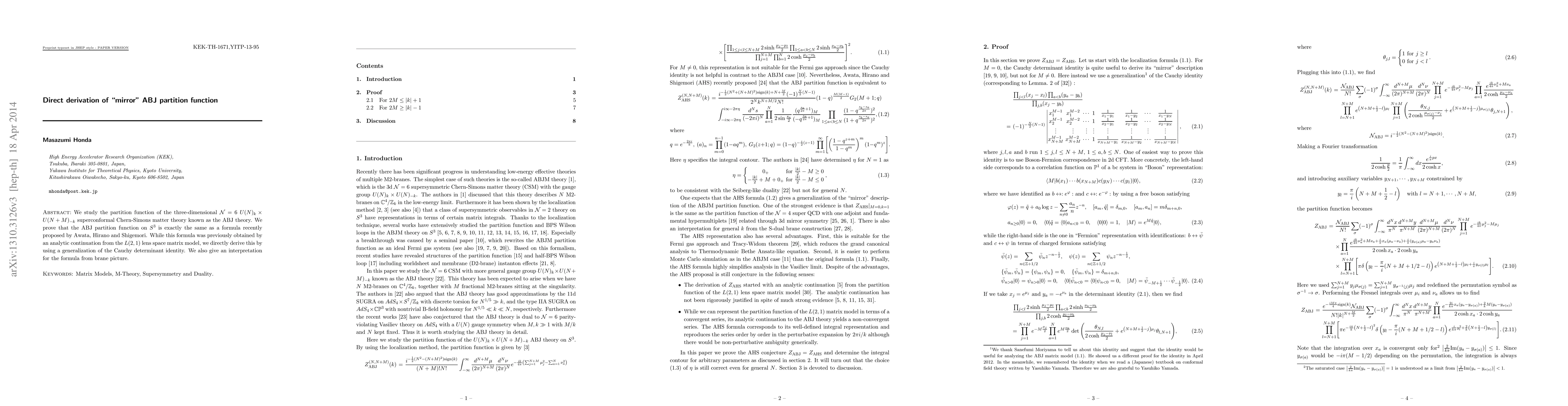 This paper derives the ABJ partition function for the N=6 U(N)_k x U(N+M)_{-k} superconformal Chern-Simons theory on S^3 directly, confirming it matches a formula proposed by Awata, Hirano, and Shigemori, and provides a brane interpretation for the result.