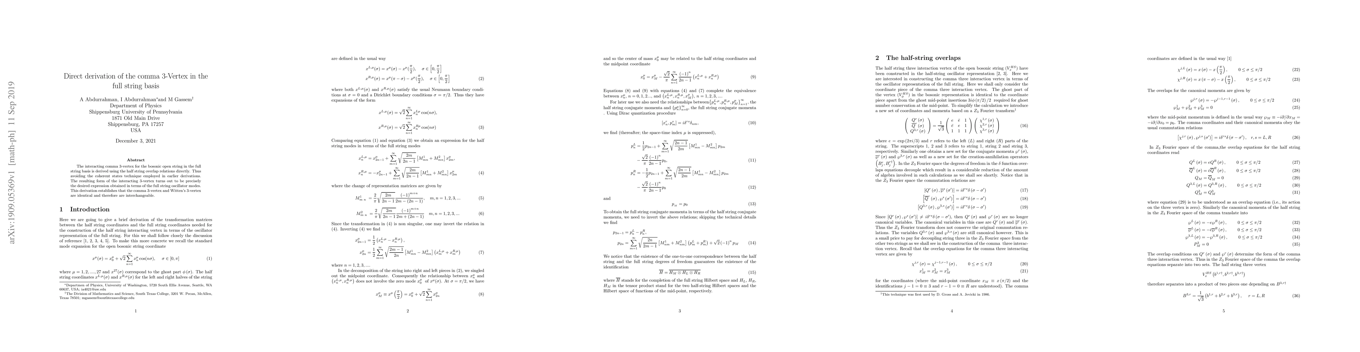 This paper derives the interacting comma 3-vertex for the bosonic open string using half string overlap relations directly, avoiding previous coherent states methods, and shows it matches Witten's 3-vertex, confirming their interchangeability in full string basis.