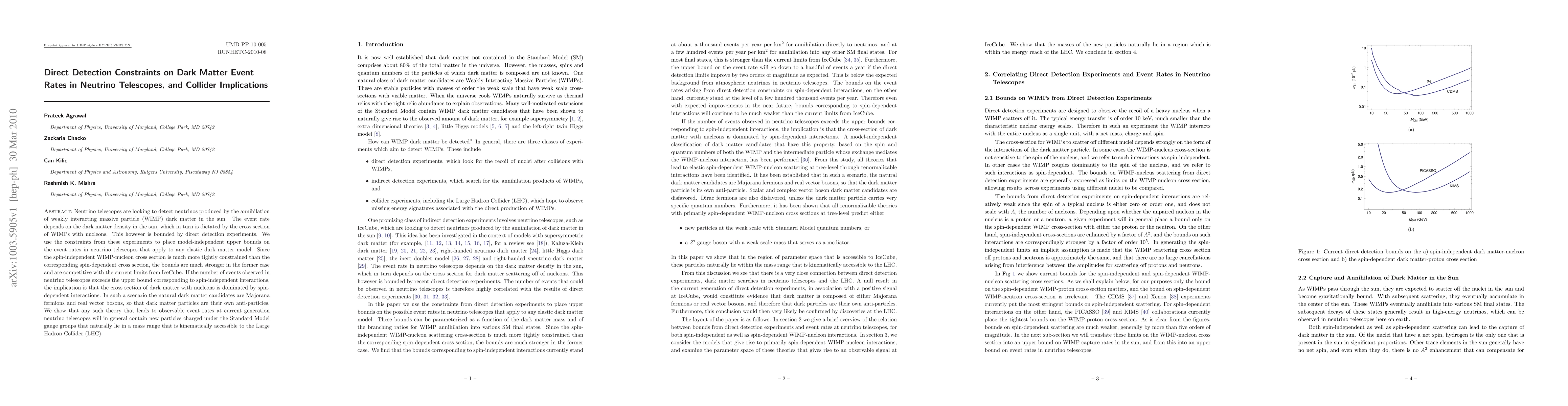 Neutrino telescopes are looking to detect neutrinos produced by the annihilation of weakly interacting massive particle (WIMP) dark matter in the sun. The event rate depends on the dark matter density in the sun, which in turn is dictated by the cross section of WIMPs with nucleons. This however is bounded by direct detection experiments. We use the constraints from these experiments to place model-independent upper bounds on the event rates in neutrino telescopes that apply to any elastic dark matter model. Since the spin-independent WIMP-nucleon cross section is much more tightly constrained than the corresponding spin-dependent cross section, the bounds are much stronger in the former case and are competitive with the current limits from IceCube. If the number of events observed in neutrino telescopes exceeds the upper bound corresponding to spin-independent interactions, the implication is that the cross section of dark matter with nucleons is dominated by spin-dependent interactions. In such a scenario the natural dark matter candidates are Majorana fermions and real vector bosons, so that dark matter particles are their own anti-particles. We show that any such theory that leads to observable event rates at current generation neutrino telescopes will in general contain new particles charged under the Standard Model gauge groups that naturally lie in a mass range that is kinematically accessible to the Large Hadron Collider (LHC).