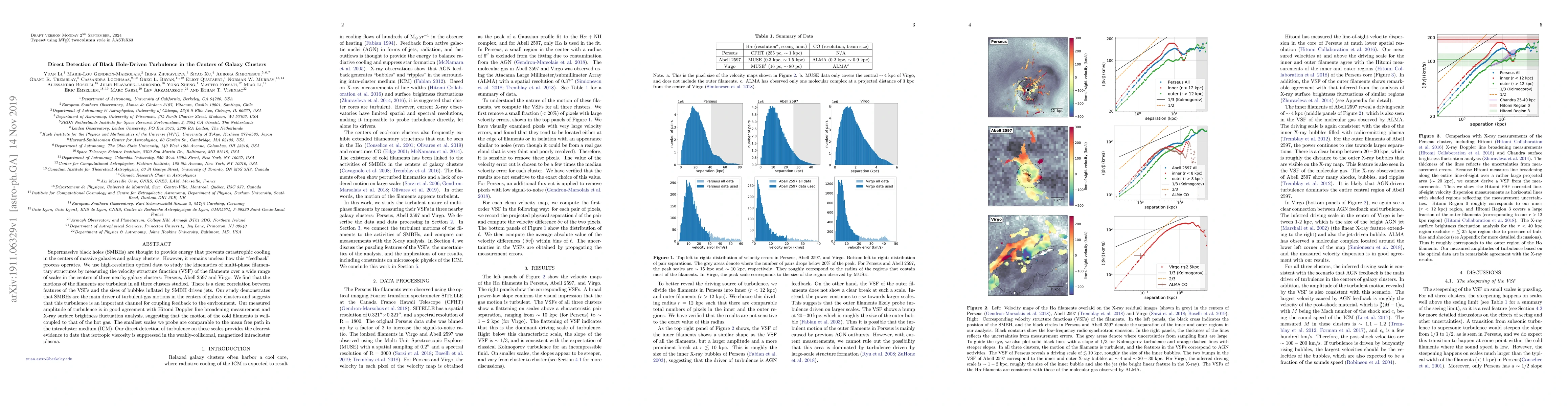 This study uses high-resolution optical data to reveal turbulent gas motions in the centers of three galaxy clusters driven by supermassive black holes (SMBHs). The analysis shows a strong correlation between filamentary structure turbulence and SMBH-driven jets, indicating that SMBHs are the primary turbulence source in these clusters.