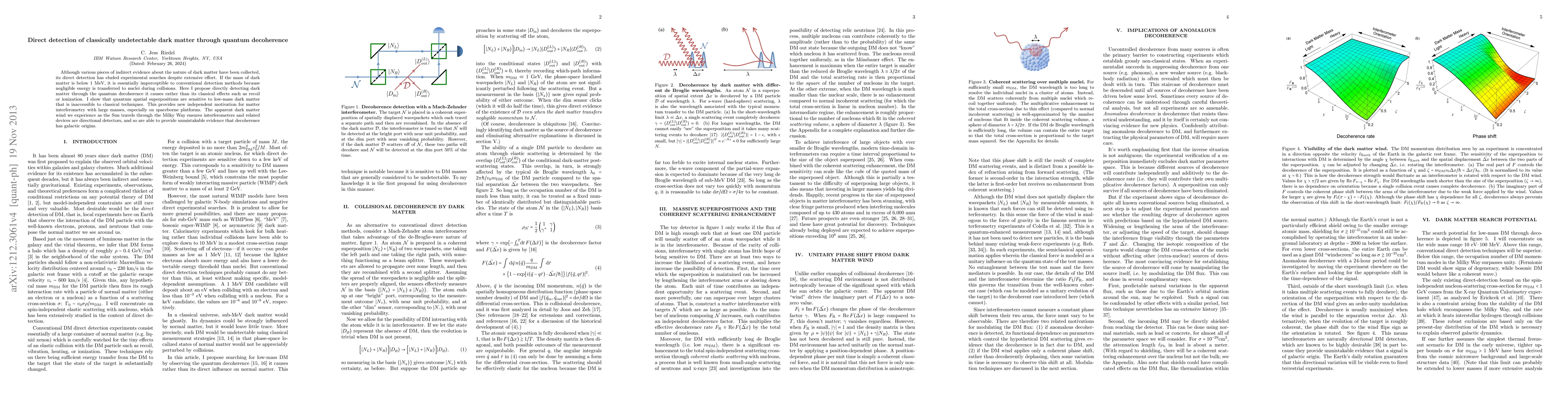 Although various pieces of indirect evidence about the nature of dark matter have been collected, its direct detection has eluded experimental searches despite extensive effort. If the mass of dark matter is below 1 MeV, it is essentially imperceptible to conventional detection methods because negligible energy is transferred to nuclei during collisions. Here I propose directly detecting dark matter through the quantum decoherence it causes rather than its classical effects such as recoil or ionization. I show that quantum spatial superpositions are sensitive to low-mass dark matter that is inaccessible to classical techniques. This provides new independent motivation for matter interferometry with large masses, especially on spaceborne platforms. The apparent dark matter wind we experience as the Sun travels through the Milky Way ensures interferometers and related devices are directional detectors, and so are able to provide unmistakable evidence that decoherence has galactic origins.