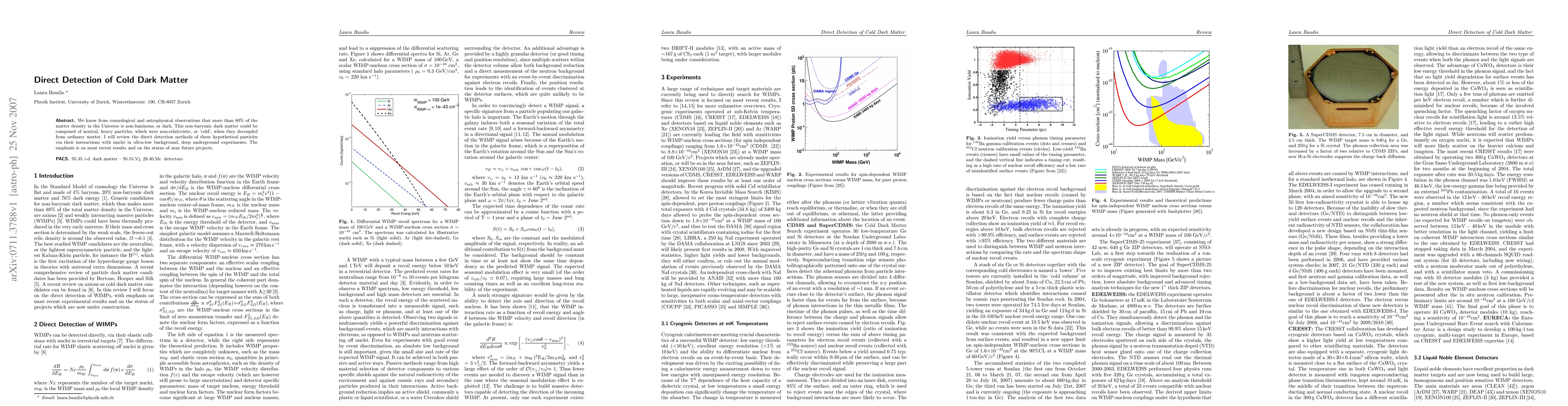 This paper reviews direct detection methods for hypothetical 'cold' dark matter particles through their interactions with nuclei in low-background, deep underground experiments. It highlights recent findings and upcoming project status, focusing on non-luminous matter constituting over 80% of the universe's density.
