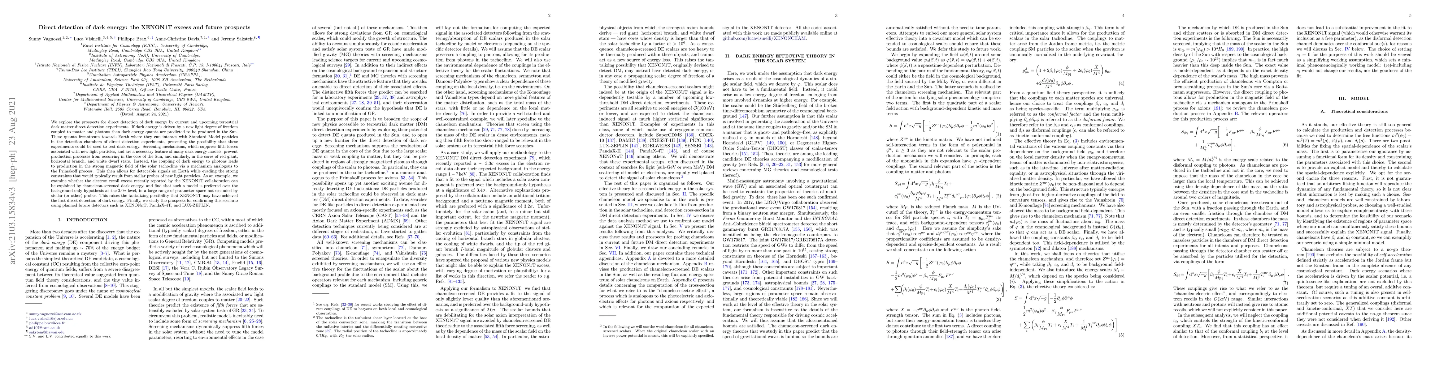 We explore the prospects for direct detection of dark energy by current and upcoming terrestrial dark matter direct detection experiments. If dark energy is driven by a new light degree of freedom coupled to matter and photons then dark energy quanta are predicted to be produced in the Sun. These quanta free-stream towards Earth where they can interact with Standard Model particles in the detection chambers of direct detection experiments, presenting the possibility that these experiments could be used to test dark energy. Screening mechanisms, which suppress fifth forces associated with new light particles, and are a necessary feature of many dark energy models, prevent production processes from occurring in the core of the Sun, and similarly, in the cores of red giant, horizontal branch, and white dwarf stars. Instead, the coupling of dark energy to photons leads to production in the strong magnetic field of the solar tachocline via a mechanism analogous to the Primakoff process. This then allows for detectable signals on Earth while evading the strong constraints that would typically result from stellar probes of new light particles. As an example, we examine whether the electron recoil excess recently reported by the XENON1T collaboration can be explained by chameleon-screened dark energy, and find that such a model is preferred over the background-only hypothesis at the $2.0\sigma$ level, in a large range of parameter space not excluded by stellar (or other) probes. This raises the tantalizing possibility that XENON1T may have achieved the first direct detection of dark energy. Finally, we study the prospects for confirming this scenario using planned future detectors such as XENONnT, PandaX-4T, and LUX-ZEPLIN.
