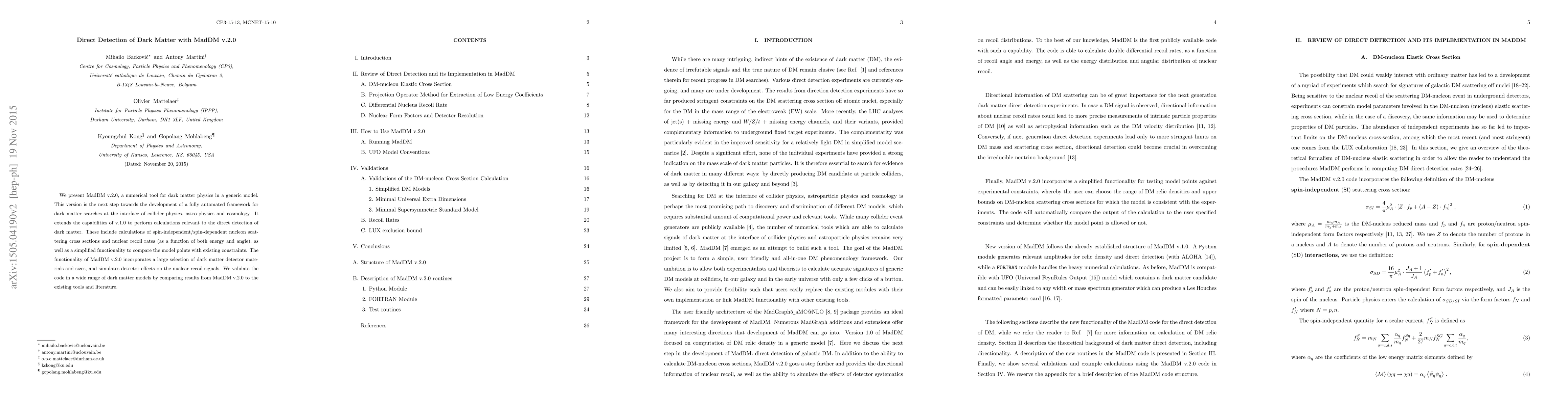 MadDM v.2.0 builds upon its predecessor by extending its capabilities to direct detection calculations, offering an integrated solution for dark matter phenomenology that combines relic density, direct detection, and future capabilities for cosmic-ray flux calculations from DM annihilation.