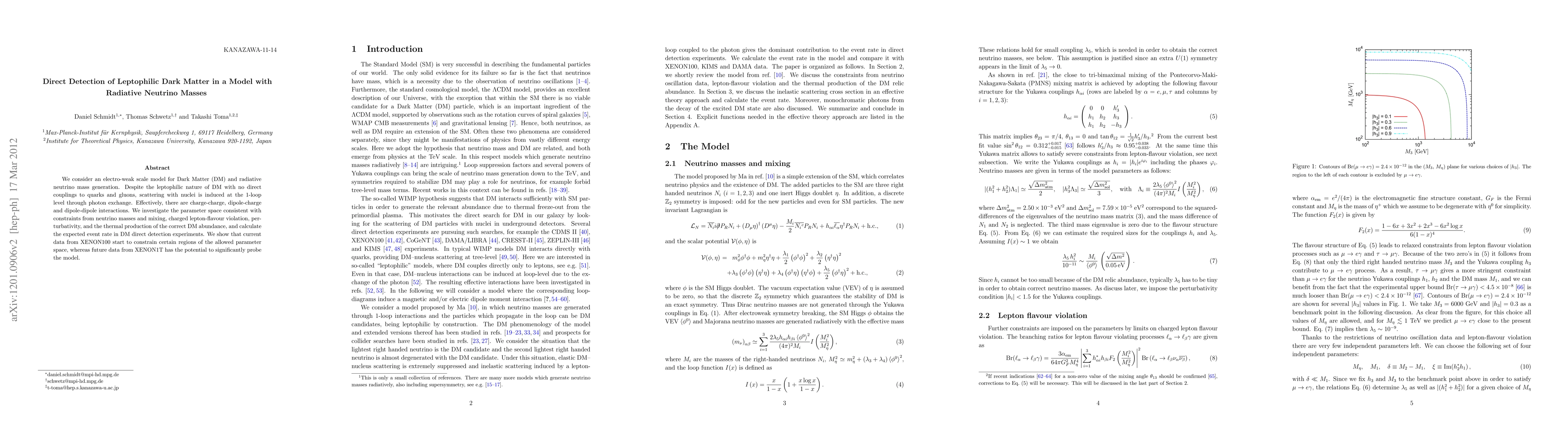 We consider an electro-weak scale model for Dark Matter (DM) and radiative neutrino mass generation. Despite the leptophilic nature of DM with no direct couplings to quarks and gluons, scattering with nuclei is induced at the 1-loop level through photon exchange. Effectively, there are charge-charge, dipole-charge and dipole-dipole interactions. We investigate the parameter space consistent with constraints from neutrino masses and mixing, charged lepton-flavour violation, perturbativity, and the thermal production of the correct DM abundance, and calculate the expected event rate in DM direct detection experiments. We show that current data from XENON100 start to constrain certain regions of the allowed parameter space, whereas future data from XENON1T has the potential to significantly probe the model.