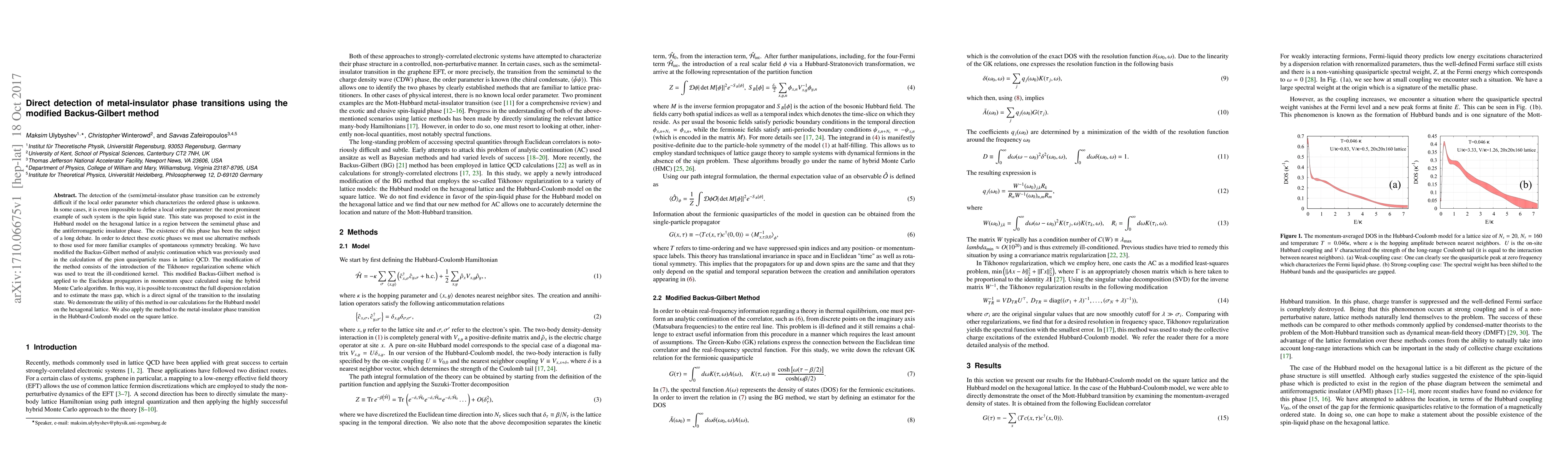 The detection of the (semi)metal-insulator phase transition can be extremely difficult if the local order parameter which characterizes the ordered phase is unknown.In some cases, it is even impossible to define a local order parameter: the most prominent example of such system is the spin liquid state. This state was proposed to exist in theHubbard model on the hexagonal lattice in a region between the semimetal phase and the antiferromagnetic insulator phase. The existence of this phase has been the subject of a long debate. In order to detect these exotic phases we must use alternative methods to those used for more familiar examples of spontaneous symmetry breaking. We have modified the Backus-Gilbert method of analytic continuation which was previously used in the calculation of the pion quasiparticle mass in lattice QCD. The modification of the method consists of the introduction of the Tikhonov regularization scheme which was used to treat the ill-conditioned kernel. This modified Backus-Gilbert method is applied to the Euclidean propagators in momentum space calculated using the hybridMonte Carlo algorithm. In this way, it is possible to reconstruct the full dispersion relation and to estimate the mass gap, which is a direct signal of the transition to the insulating state. We demonstrate the utility of this method in our calculations for the Hubbard model on the hexagonal lattice. We also apply the method to the metal-insulator phase transition in the Hubbard-Coulomb model on the square lattice.