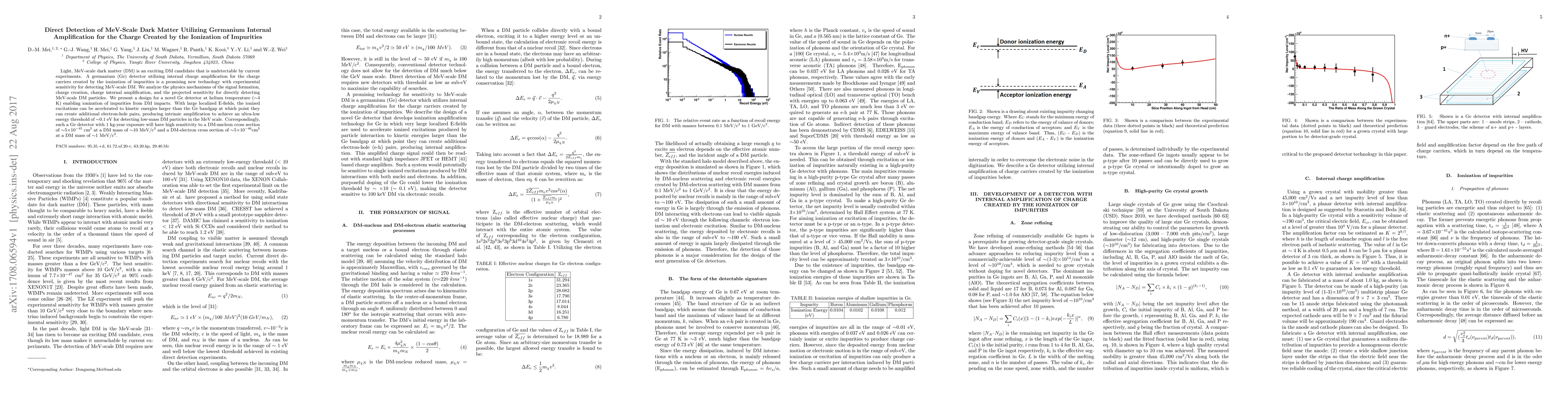 This paper proposes a novel germanium detector utilizing internal charge amplification to detect MeV-scale dark matter (DM) particles. The design leverages ionization of impurities and large localized electric fields to achieve an ultra-low energy threshold of 0.1 eV, enabling high sensitivity to DM interactions.