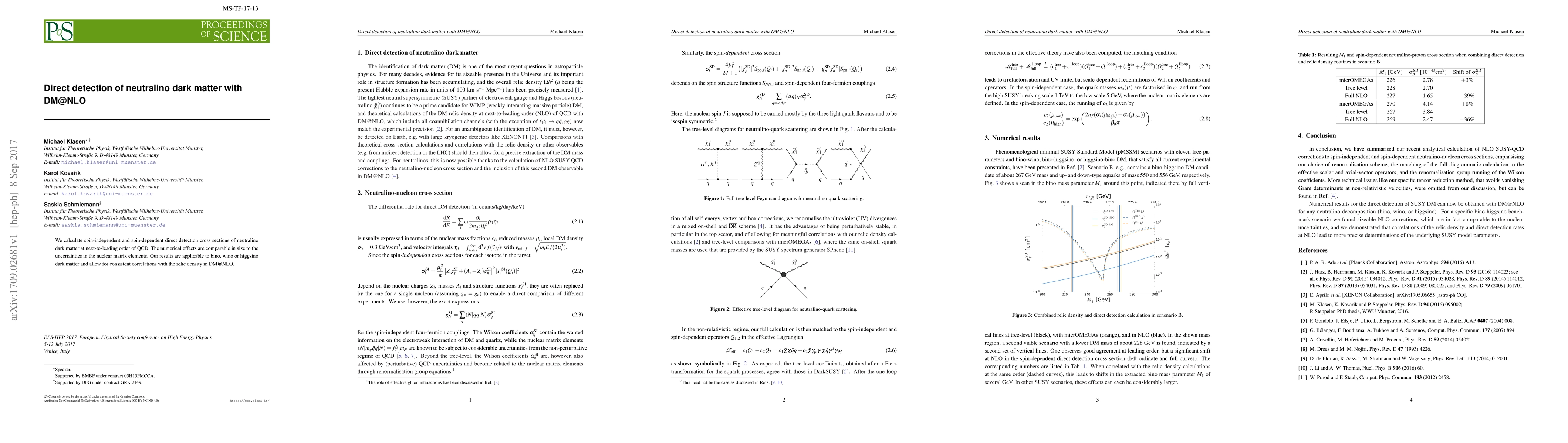 We calculate spin-independent and spin-dependent direct detection cross sections of neutralino dark matter at next-to-leading order of QCD. The numerical effects are comparable in size to the uncertainties in the nuclear matrix elements. Our results are applicable to bino, wino or higgsino dark matter and allow for consistent correlations with the relic density in DM@NLO.