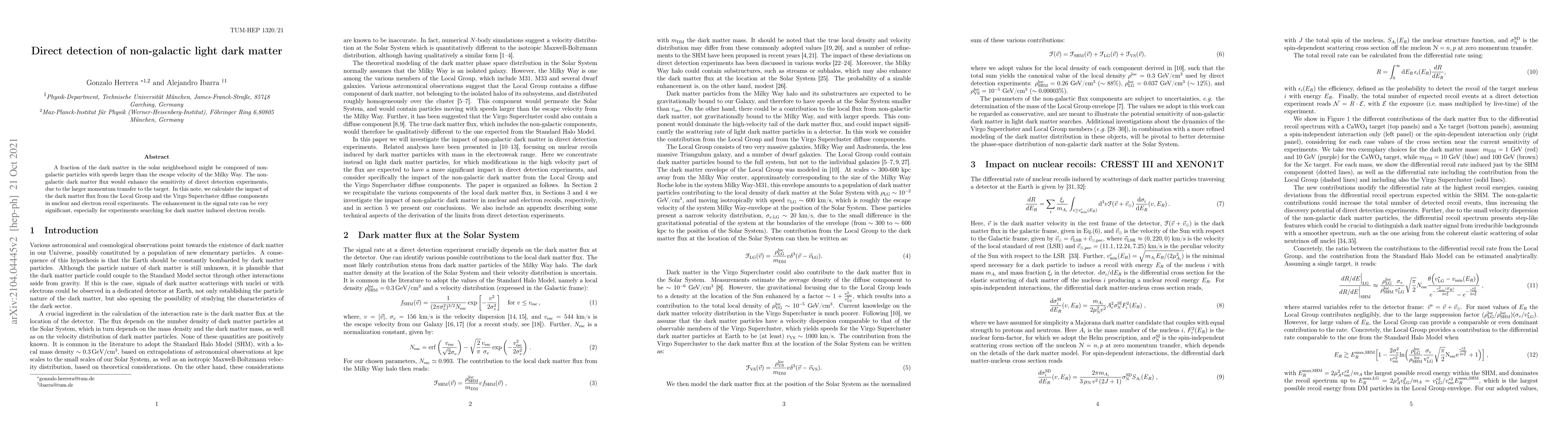 A fraction of the dark matter in the solar neighborhood might be composed of non-galactic particles with speeds larger than the escape velocity of the Milky Way. The non-galactic dark matter flux would enhance the sensitivity of direct detection experiments, due to the larger momentum transfer to the target. In this note, we calculate the impact of the dark matter flux from the Local Group and the Virgo Supercluster diffuse components in nuclear and electron recoil experiments. The enhancement in the signal rate can be very significant, especially for experiments searching for dark matter induced electron recoils.
