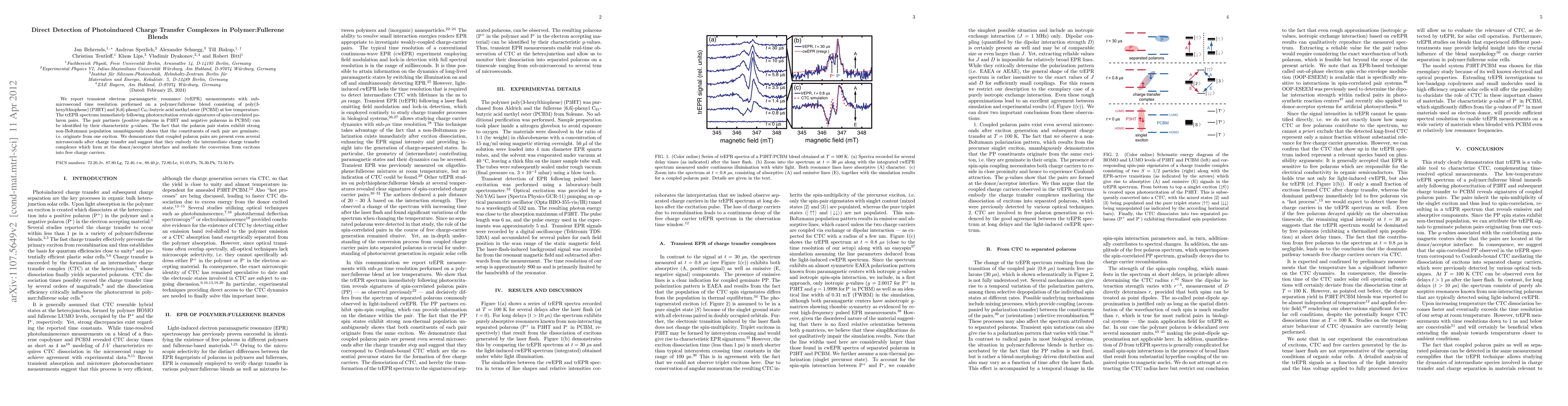 The research utilizes transient electron paramagnetic resonance (trEPR) to directly detect photoinduced charge transfer complexes in P3HT:PCBM polymer blends. It reveals the formation of spin-correlated polaron pairs (positive in P3HT, negative in PCBM) with non-Boltzmann population, indicating geminate pairing from excitons. These coupled polaron pairs persist for microseconds, suggesting their role as intermediates in exciton-to-charge carrier conversion at the donor/acceptor interface.