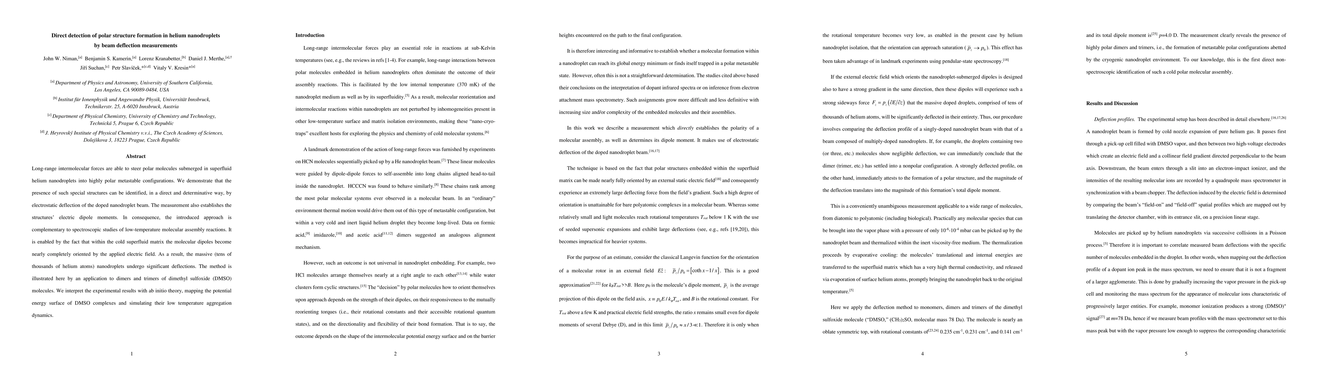 This paper demonstrates a novel method for detecting the formation of polar structures in helium nanodroplets via electrostatic beam deflection, establishing the electric dipole moments of these structures. The approach complements spectroscopic studies and is illustrated through the analysis of DMSO dimers and trimers, supported by ab initio theory.