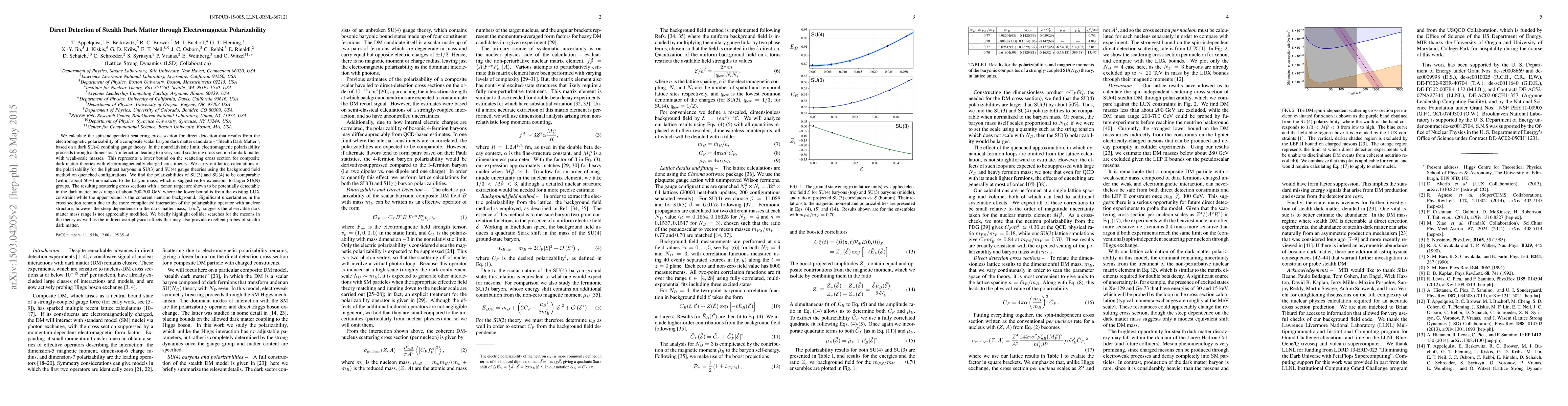We calculate the spin-independent scattering cross section for direct detection that results from the electromagnetic polarizability of a composite scalar baryon dark matter candidate -- "Stealth Dark Matter", that is based on a dark SU(4) confining gauge theory. In the nonrelativistic limit, electromagnetic polarizability proceeds through a dimension-7 interaction leading to a very small scattering cross section for dark matter with weak scale masses. This represents a lower bound on the scattering cross section for composite dark matter theories with electromagnetically charged constituents. We carry out lattice calculations of the polarizability for the lightest baryons in SU(3) and SU(4) gauge theories using the background field method on quenched configurations. We find the polarizabilities of SU(3) and SU(4) to be comparable (within about 50%) normalized to the baryon mass, which is suggestive for extensions to larger SU(N) groups. The resulting scattering cross sections with a xenon target are shown to be potentially detectable in the dark matter mass range of about 200-700 GeV, where the lower bound is from the existing LUX constraint while the upper bound is the coherent neutrino background. Significant uncertainties in the cross section remain due to the more complicated interaction of the polarizablity operator with nuclear structure, however the steep dependence on the dark matter mass, $1/m_B^6$, suggests the observable dark matter mass range is not appreciably modified. We briefly highlight collider searches for the mesons in the theory as well as the indirect astrophysical effects that may also provide excellent probes of stealth dark matter.