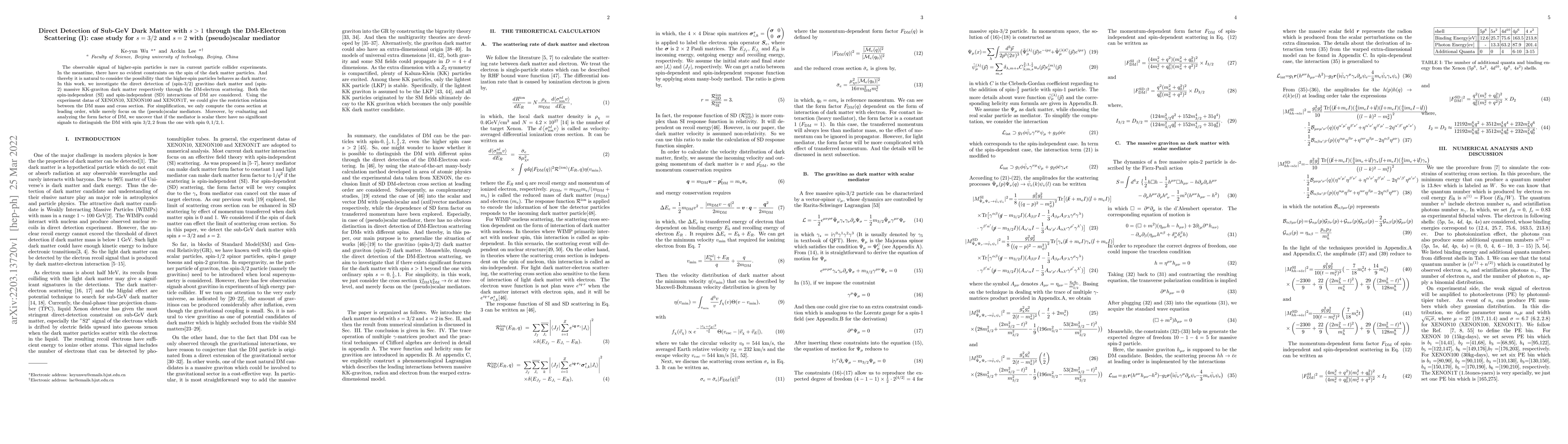The observable signal of higher-spin particles is rare in current particle collider experiments. In the meantime, there have no evident constraints on the spin of the dark matter particles. And thereby it is natural to consider the possibility that the higher-spin particles behaves as dark matter. In this work, we investigate the direct detection of (spin-$3/2$) gravitino dark matter and (spin-$2$) massive KK-graviton dark matter respectively through the DM-electron scattering. Both the spin-independent (SI) and spin-independent (SD) interactions of DM are considered. Using the experiment datas of XENON10, XENON100 and XENON1T, we could give the restriction relation between the DM mass and cross section. For simplification, we only compute the corss section at leading order, while merely focus on the (pseudo)scalar mediators. Moreover, by evaluating and analyzing the form factor of DM, we uncover that if the mediator is scalar there have no significant signals to distinguish the DM with spin $3/2,2$ from the one with spin $0,1/2,1$.
