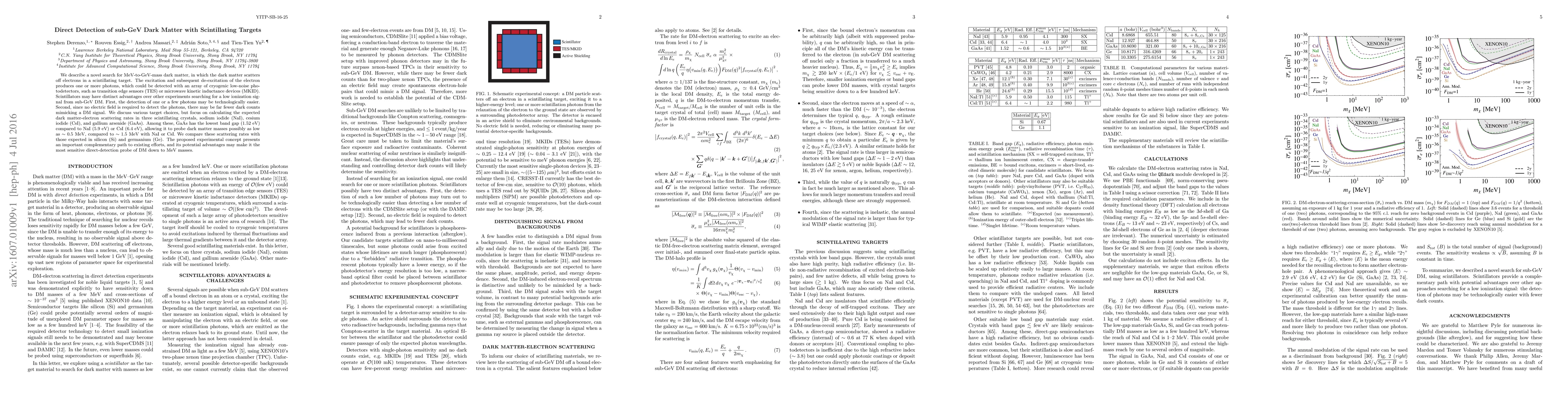 This paper proposes a novel method for detecting sub-GeV dark matter using scintillating targets where dark matter scatters off electrons, producing detectable photons. The method aims to overcome limitations of other detection techniques by utilizing materials like GaAs, which has a lower band gap, potentially allowing detection of dark matter as low as 0.5 MeV.