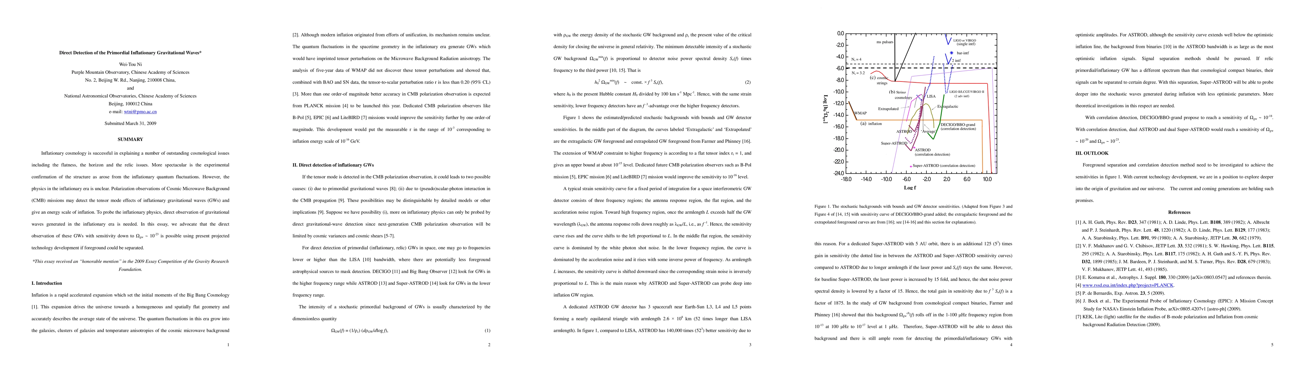 This paper discusses the potential for directly detecting primordial inflationary gravitational waves, which could provide insights into the physics of the inflationary era. The authors propose that current technological advancements may enable the detection of these waves with a sensitivity level of Omega-gw down to 10**(-23), contingent on the separation of foreground interference.