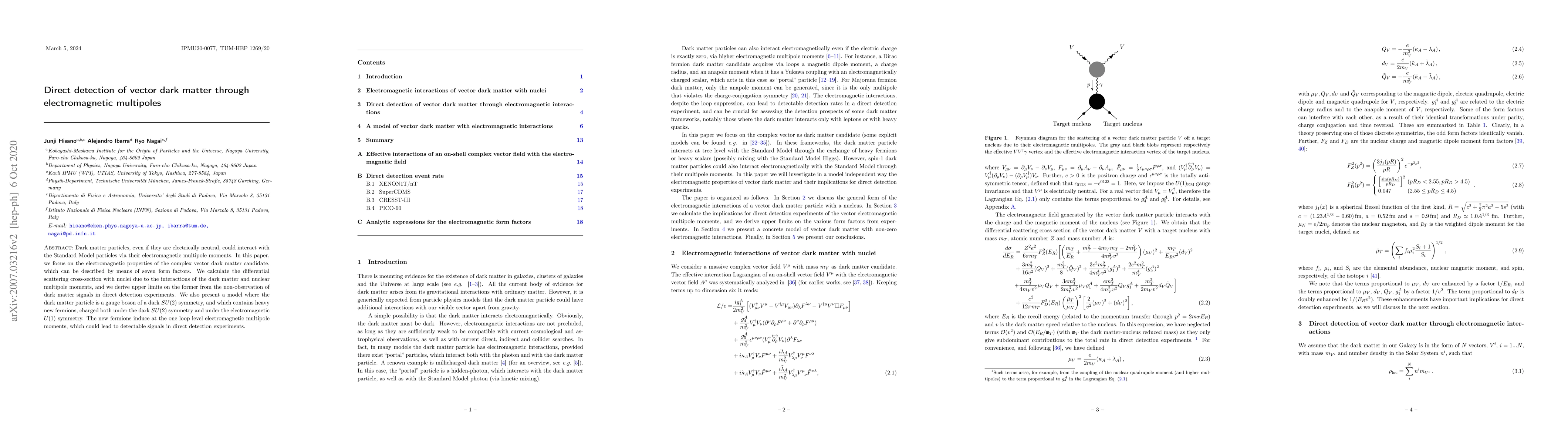 This paper explores the direct detection of vector dark matter via electromagnetic multipole moments, calculating the differential scattering cross-section for interactions with nuclei. It derives upper limits on the scattering cross-section from experimental non-observations and proposes a model with gauge boson dark matter and heavy fermions inducing detectable electromagnetic multipole moments.