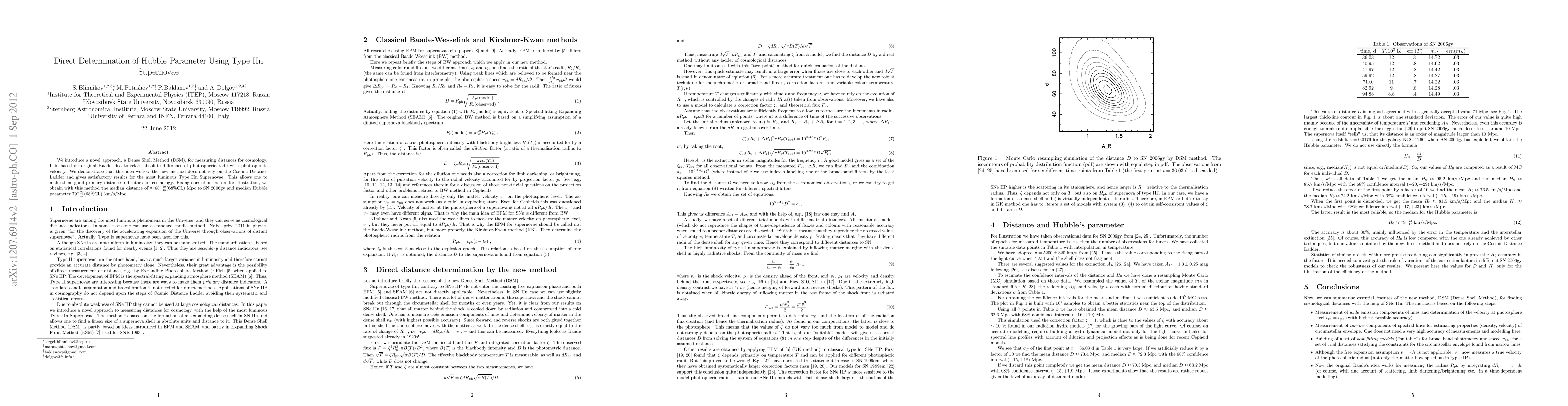 We introduce a novel approach, a Dense Shell Method (DSM), for measuring distances for cosmology. It is based on original Baade idea to relate absolute difference of photospheric radii with photospheric velocity. We demonstrate that this idea works: the new method does not rely on the Cosmic Distance Ladder and gives satisfactory results for the most luminous Type IIn Supernovae. This allows one to make them good primary distance indicators for cosmology. Fixing correction factors for illustration, we obtain with this method the median distance of 68^{+19}_{-15} (68%CL) Mpc to SN 2006gy and median Hubble parameter 79^{+23}_{-17} (68%CL) km/s/Mpc.