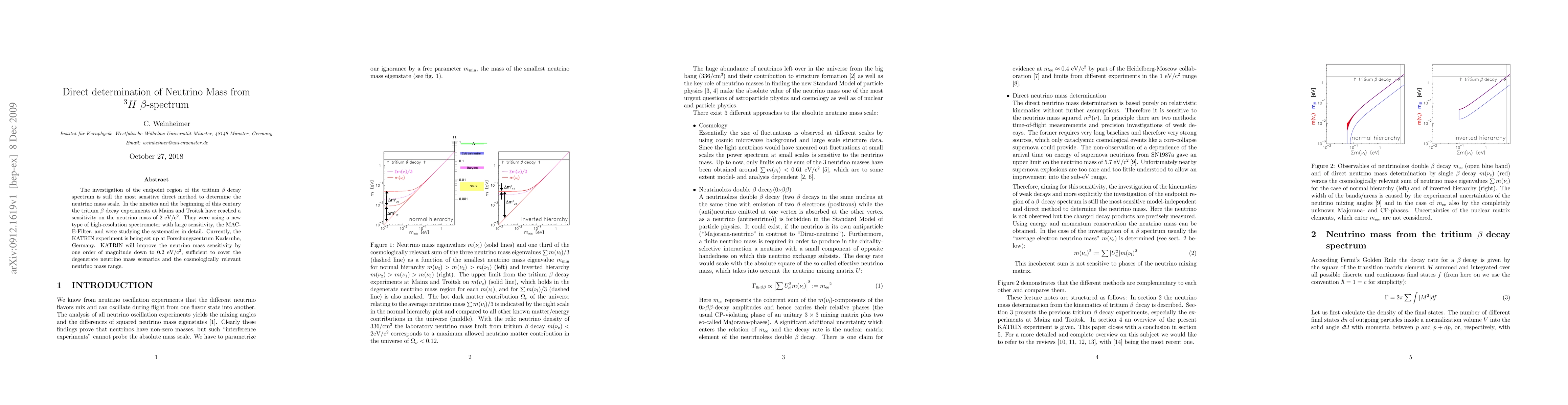 This paper discusses the direct determination of neutrino mass using the tritium beta decay spectrum, highlighting the advancements in sensitivity achieved by the KATRIN experiment, which aims to improve detection limits by an order of magnitude to 0.2 eV/c^2, surpassing previous experiments and enabling exploration of cosmologically relevant neutrino mass ranges.