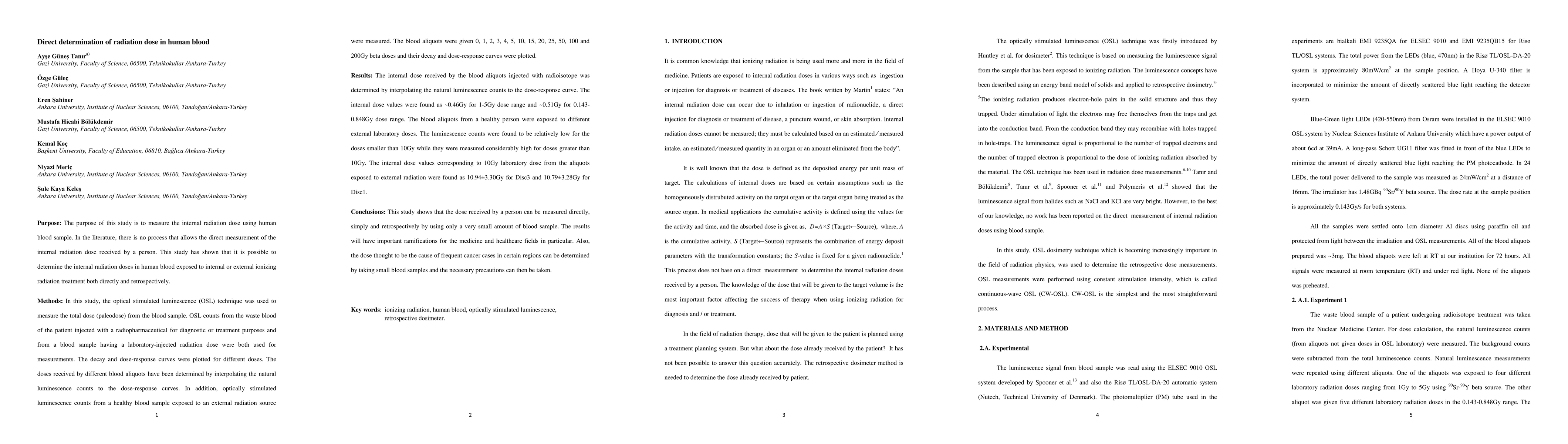 Our purpose is to measure the internal radiation dose (ID) using human blood sample. In the literature, there is no process that allows the direct measurement of ID received by a person. This study has shown that it is possible to determine ID in human blood exposed to internal or external ionizing radiation treatment both directly and retrospectively. OSL technique was used to measure the total dose from the blood sample. OSL counts from the waste blood of the patient injected with a radiopharmaceutical for diagnostic or treatment purposes and from a blood sample having a laboratory-injected radiation dose were both used for measurements. The decay and dose-response curves (DRC) were plotted for different doses. The doses received by different blood aliquots have been determined by interpolating the natural luminescence counts to DRC. In addition, OSL counts from a healthy blood sample exposed to an external radiation source were measured. The blood aliquots were given different 0-200Gy beta doses and their decay and dose-response curves were plotted. The internal dose received by the blood aliquots injected with radioisotope was determined by interpolating the natural luminescence counts to DRC. The internal dose values were found as 0.46Gy and 0.51Gy for different dose range. The blood aliquots were exposed to different external laboratory doses. The internal dose values corresponding to 10Gy laboratory dose from the aliquots exposed to external radiation were found as 10.94Gy for Disc3 and ~10.79Gy for Disc1.This study shows that the dose received by a person can be measured directly, simply and retrospectively by using only a very small amount of blood sample. The results will have important ramifications for the medicine and healthcare fields in particular.