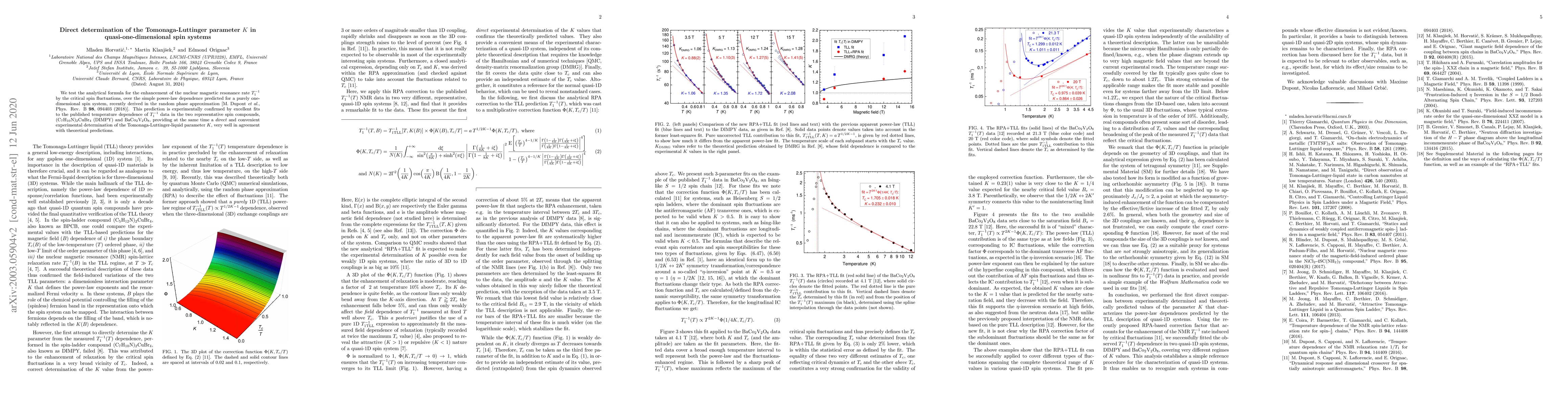 This paper confirms the analytical formula for the enhancement of nuclear magnetic resonance rate $T_1^{-1}$ in quasi-one-dimensional spin systems, providing a direct determination of the Tomonaga-Luttinger-liquid parameter $K$ through excellent fits to experimental data in DIMPY and BaCo$_2$V$_2$O$_8$ compounds. The results align well with theoretical predictions.