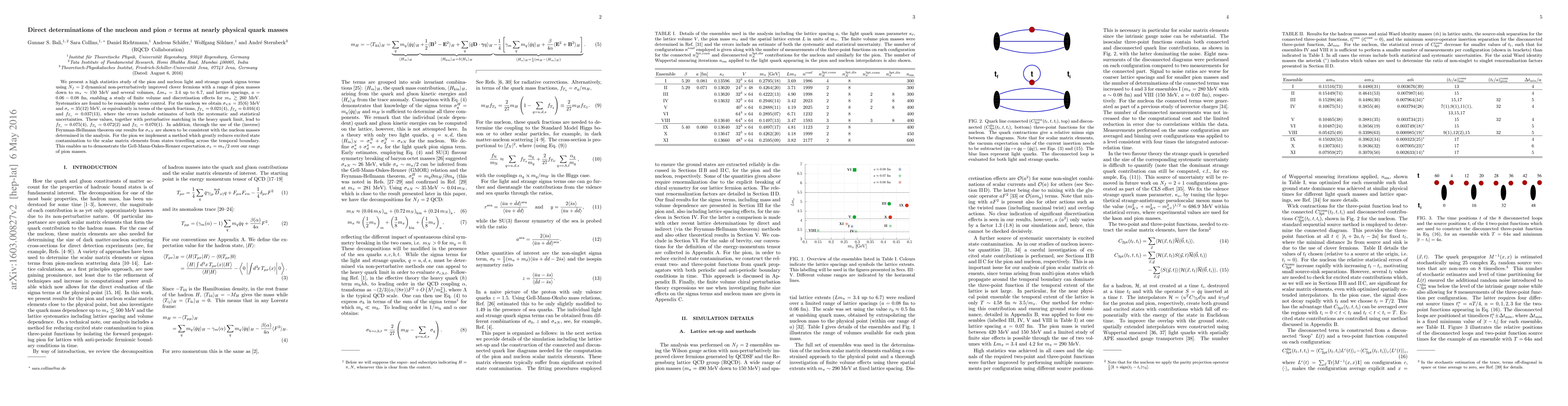 We present a high statistics study of the pion and nucleon light and strange quark sigma terms using $N_f=2$ dynamical non-perturbatively improved clover fermions with a range of pion masses down to $m_\pi\sim 150$ MeV and several volumes, $Lm_\pi=3.4$ up to $6.7$, and lattice spacings, $a=0.06-0.08$ fm, enabling a study of finite volume and discretisation effects for $m_\pi\gtrsim 260$ MeV. Systematics are found to be reasonably under control. For the nucleon we obtain $\sigma_{\pi N}=35(6)$ MeV and $\sigma_s=35(12)$ MeV, or equivalently in terms of the quark fractions, $f_{T_u}=0.021(4)$, $f_{T_d}=0.016(4)$ and $f_{T_s}=0.037(13)$, where the errors include estimates of both the systematic and statistical uncertainties. These values, together with perturbative matching in the heavy quark limit, lead to $f_{T_c}=0.075(4)$, $f_{T_b}=0.072(2)$ and $f_{T_t}=0.070(1)$. In addition, through the use of the (inverse) Feynman-Hellmann theorem our results for $\sigma_{\pi N}$ are shown to be consistent with the nucleon masses determined in the analysis. For the pion we implement a method which greatly reduces excited state contamination to the scalar matrix elements from states travelling across the temporal boundary. This enables us to demonstrate the Gell-Mann-Oakes-Renner expectation $\sigma_\pi=m_\pi/2$ over our range of pion masses.
