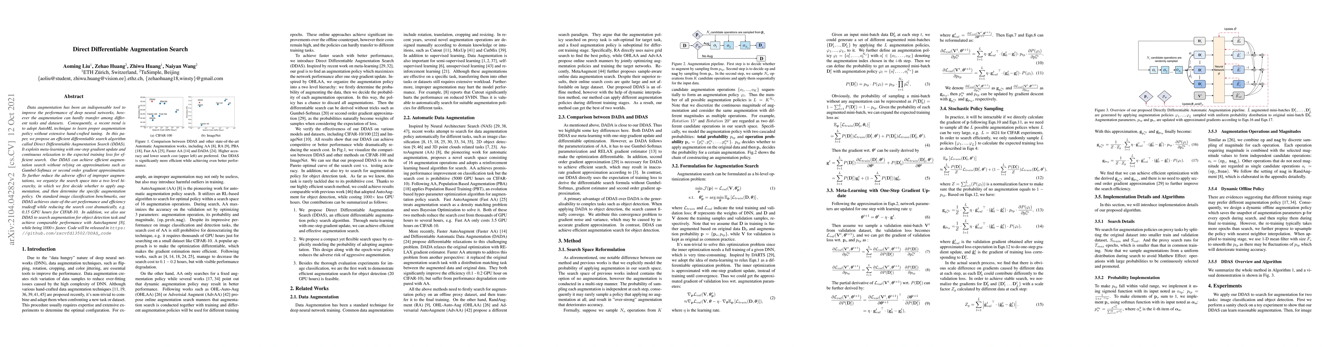 This paper introduces Direct Differentiable Augmentation Search (DDAS), an efficient differentiable search algorithm that leverages meta-learning and continuous relaxation to optimize data augmentation policies for deep neural networks. DDAS achieves state-of-the-art performance and efficiency on image classification benchmarks, significantly reducing search costs and outperforming AutoAugment in object detection tasks.