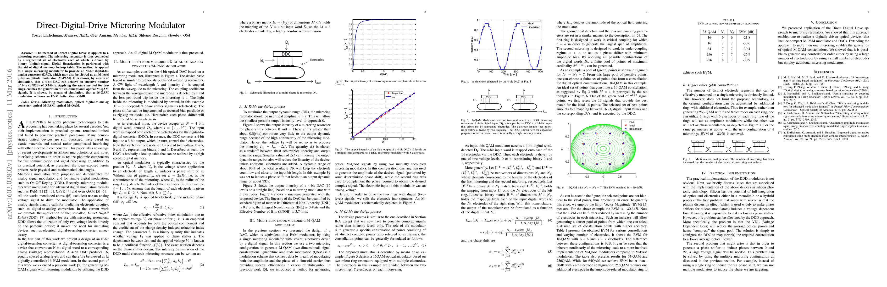 The method of Direct Digital Drive is applied to a microring resonator. The microring resonator is thus controlled by a segmented set of electrodes each of which is driven by binary (digital) signal. Digital linearization is performed with the aid of digital memory lookup table. The method is applied to a single microring modulator to provide an M-bit digital-toanalog converter (DAC), which may also be viewed as an M-level pulse amplitude modulator (M-PAM). It is shown, by means of simulation, that a 4-bit DAC can achieve an effective number of bits (ENOB) of 3.74bits. Applying the same method for two rings, enables the generation of two-dimensional optical M-QAM signals. It is shown, by means of simulation, that a 16-QAM modulator achieves an EVM better than -30dB.