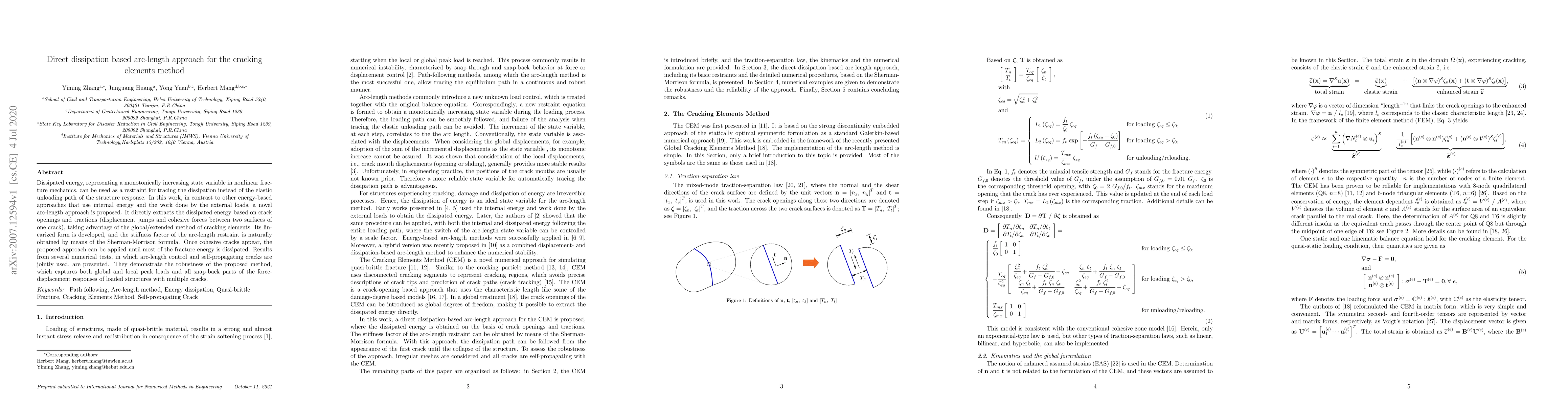 Dissipated energy, representing a monotonically increasing state variable in nonlinear fracture mechanics, can be used as a restraint for tracing the dissipation instead of the elastic unloading path of the structure response. In this work, in contrast to other energy-based approaches that use internal energy and the work done by the external loads, a novel arc-length approach is proposed. It directly extracts the dissipated energy based on crack openings and tractions (displacement jumps and cohesive forces between two surfaces of one crack), taking advantage of the global/extended method of cracking elements. Its linearized form is developed, and the stiffness factor of the arc-length restraint is naturally obtained by means of the Sherman-Morrison formula. Once cohesive cracks appear, the proposed approach can be applied until most of the fracture energy is dissipated. Results from several numerical tests, in which arc-length control and self-propagating cracks are jointly used, are presented. They demonstrate the robustness of the proposed method, which captures both global and local peak loads and all snap-back parts of the force-displacement responses of loaded structures with multiple cracks.