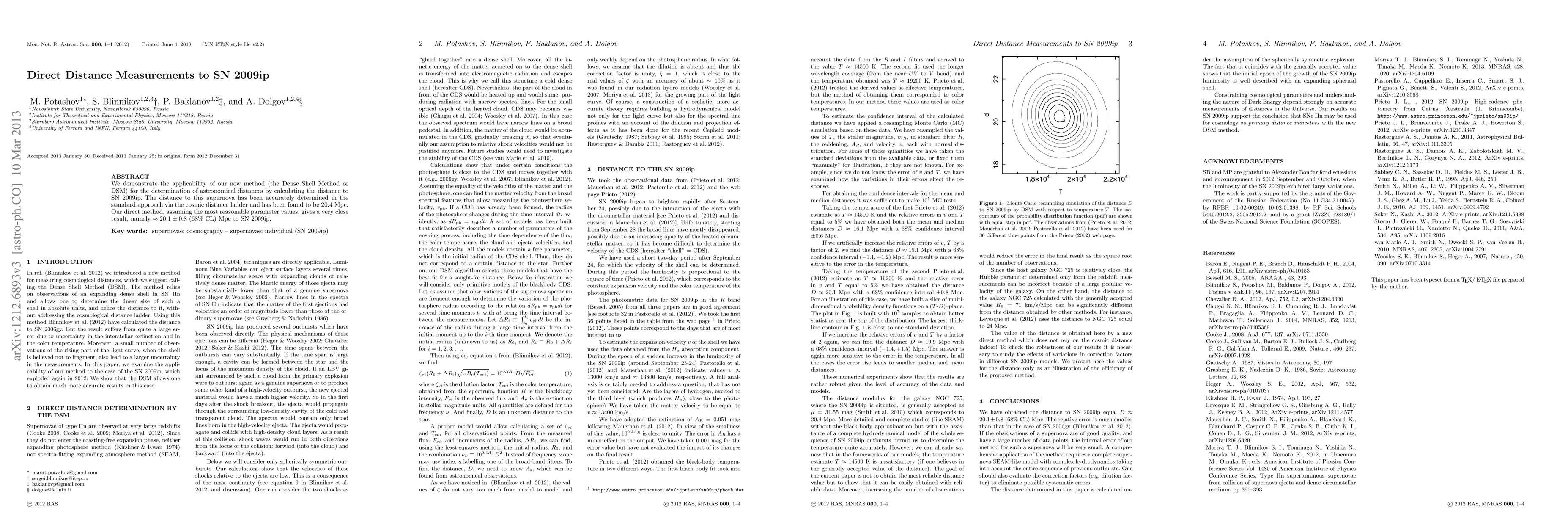 We demonstrate the applicability of our new method (the Dense Shell Method or DSM) for the determination of astronomical distances by calculating the distance to SN2009ip. The distance to this supernova has been accurately determined in the standard approach via the cosmic distance ladder and has been found to be 20.4 Mpc. Our direct method, assuming the most reasonable parameter values, gives a very close result, namely 20.1+/-0.8 (68% CL) Mpc to SN2009ip.