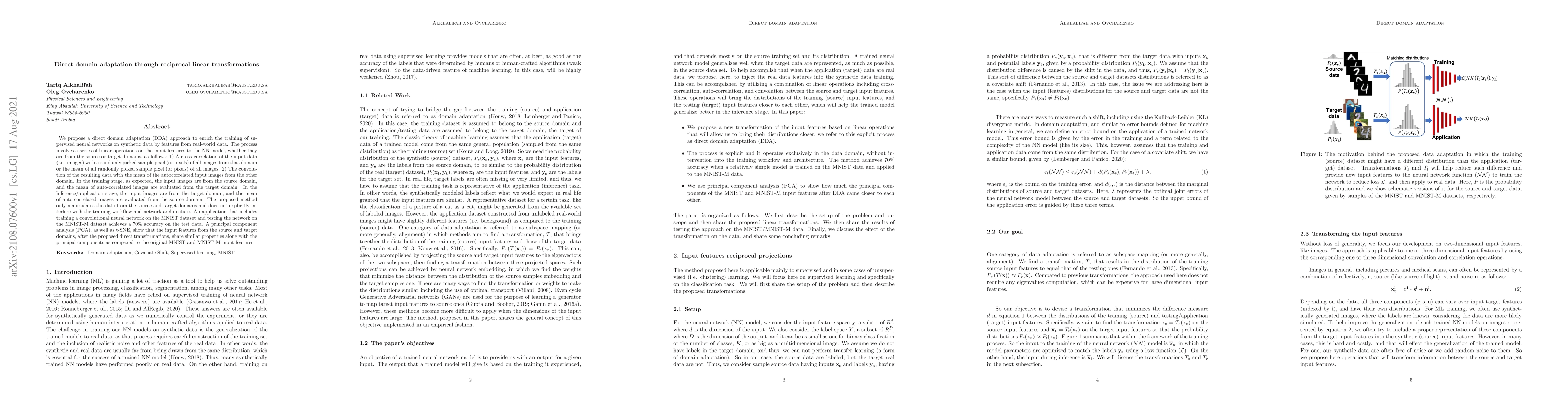 We propose a direct domain adaptation (DDA) approach to enrich the training of supervised neural networks on synthetic data by features from real-world data. The process involves a series of linear operations on the input features to the NN model, whether they are from the source or target domains, as follows: 1) A cross-correlation of the input data (i.e. images) with a randomly picked sample pixel (or pixels) of all images from that domain or the mean of all randomly picked sample pixel (or pixels) of all images. 2) The convolution of the resulting data with the mean of the autocorrelated input images from the other domain. In the training stage, as expected, the input images are from the source domain, and the mean of auto-correlated images are evaluated from the target domain. In the inference/application stage, the input images are from the target domain, and the mean of auto-correlated images are evaluated from the source domain. The proposed method only manipulates the data from the source and target domains and does not explicitly interfere with the training workflow and network architecture. An application that includes training a convolutional neural network on the MNIST dataset and testing the network on the MNIST-M dataset achieves a 70% accuracy on the test data. A principal component analysis (PCA), as well as t-SNE, show that the input features from the source and target domains, after the proposed direct transformations, share similar properties along with the principal components as compared to the original MNIST and MNIST-M input features.