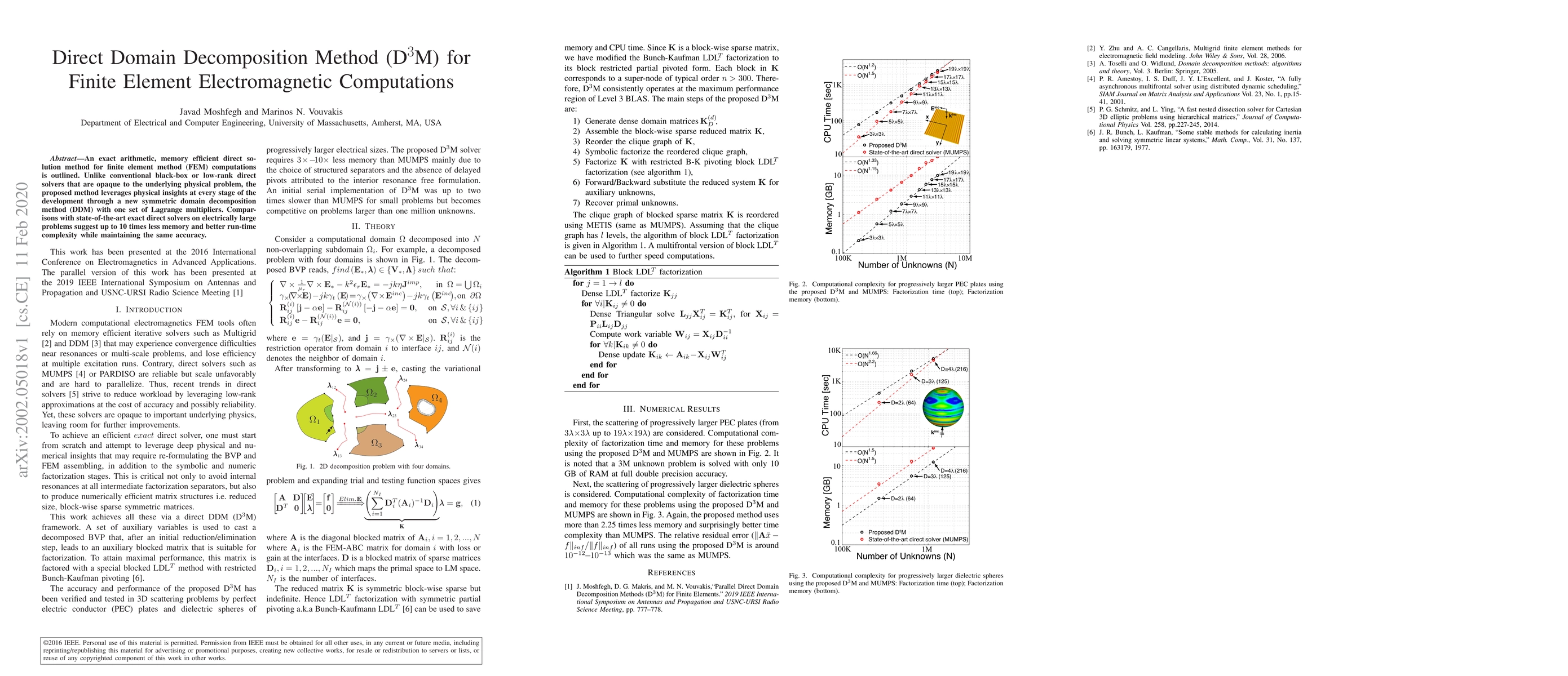 The paper proposes a Direct Domain Decomposition Method (D3M) for efficient finite element electromagnetic computations, leveraging physical insights to achieve up to 10 times less memory usage and better runtime complexity compared to conventional solvers, while maintaining accuracy.