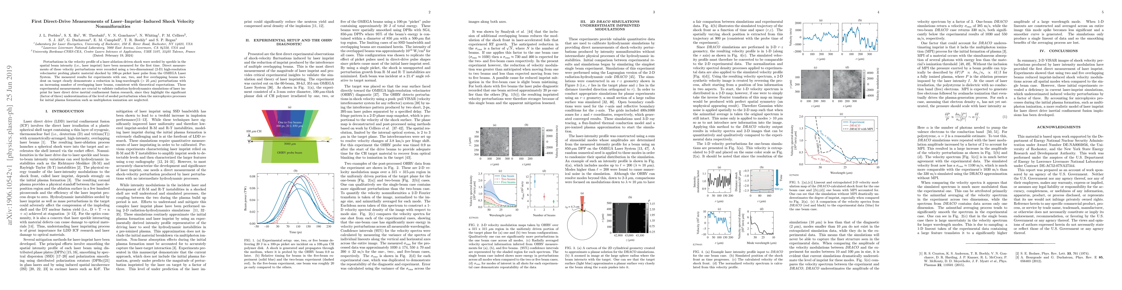 This paper reports direct measurements of shock velocity perturbations induced by laser imprint in laser-ablation-driven shock waves, showing a reduction in long-wavelength perturbations with more overlapping laser beams. These findings are vital for validating radiation-hydrodynamics simulations in laser direct drive inertial fusion research.