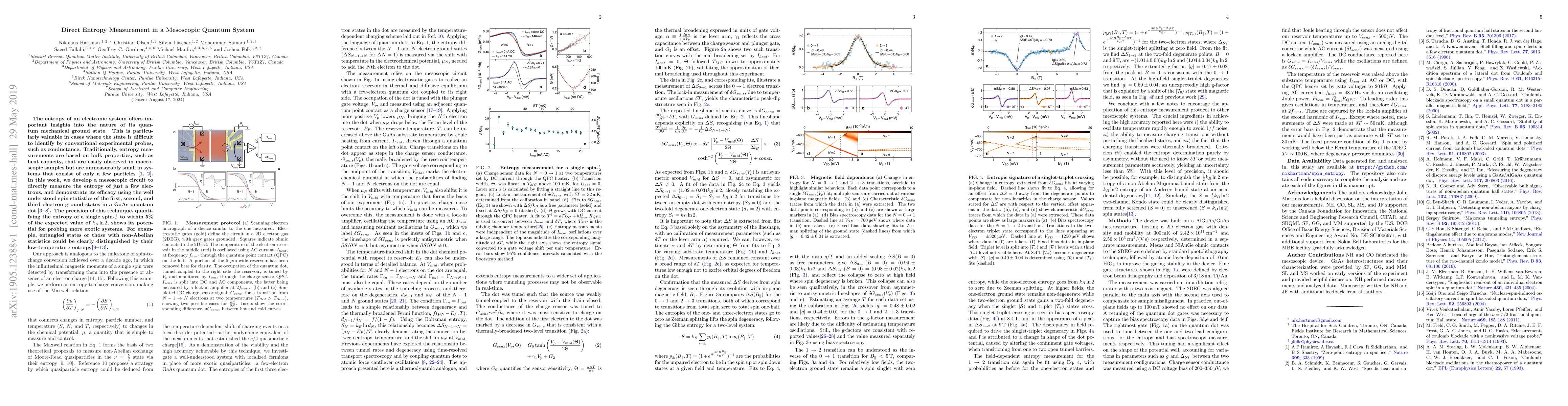 The entropy of an electronic system offers important insights into the nature of its quantum mechanical ground state. This is particularly valuable in cases where the state is difficult to identify by conventional experimental probes, such as conductance. Traditionally, entropy measurements are based on bulk properties, such as heat capacity, that are easily observed in macroscopic samples but are unmeasurably small in systems that consist of only a few particles. In this work, we develop a mesoscopic circuit to directly measure the entropy of just a few electrons, and demonstrate its efficacy using the well understood spin statistics of the first, second, and third electron ground states in a GaAs quantum dot. The precision of this technique, quantifying the entropy of a single spin-$\frac{1}{2}$ to within 5\% of the expected value of $k_B \ln{2}$, shows its potential for probing more exotic systems. For example, entangled states or those with non-Abelian statistics could be clearly distinguished by their low-temperature entropy.