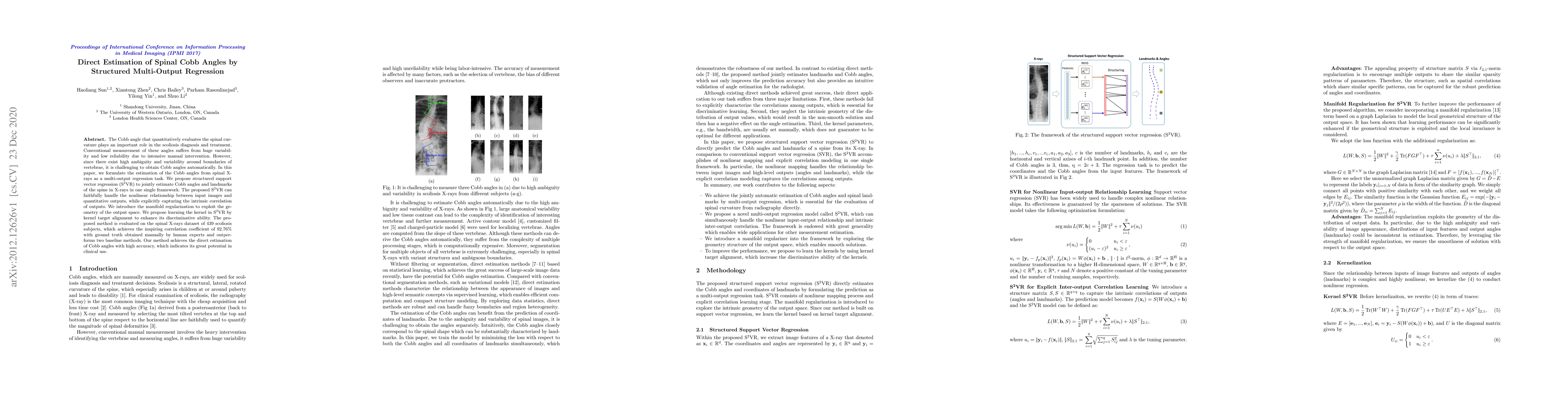The Cobb angle that quantitatively evaluates the spinal curvature plays an important role in the scoliosis diagnosis and treatment. Conventional measurement of these angles suffers from huge variability and low reliability due to intensive manual intervention. However, since there exist high ambiguity and variability around boundaries of vertebrae, it is challenging to obtain Cobb angles automatically. In this paper, we formulate the estimation of the Cobb angles from spinal X-rays as a multi-output regression task. We propose structured support vector regression (S^2VR) to jointly estimate Cobb angles and landmarks of the spine in X-rays in one single framework. The proposed S^2VR can faithfully handle the nonlinear relationship between input images and quantitative outputs, while explicitly capturing the intrinsic correlation of outputs. We introduce the manifold regularization to exploit the geometry of the output space. We propose learning the kernel in S2VR by kernel target alignment to enhance its discriminative ability. The proposed method is evaluated on the spinal X-rays dataset of 439 scoliosis subjects, which achieves the inspiring correlation coefficient of 92.76% with ground truth obtained manually by human experts and outperforms two baseline methods. Our method achieves the direct estimation of Cobb angles with high accuracy, which indicates its great potential in clinical use.