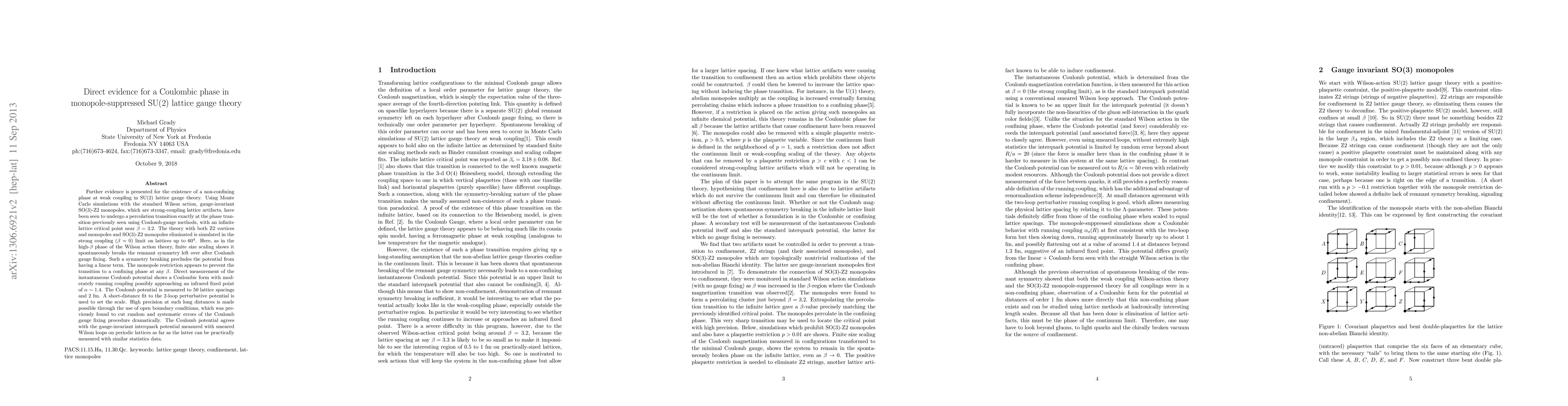 Further evidence is presented for the existence of a non-confining phase at weak coupling in SU(2) lattice gauge theory. Using Monte Carlo simulations with the standard Wilson action, gauge-invariant SO(3)-Z2 monopoles, which are strong-coupling lattice artifacts, have been seen to undergo a percolation transition exactly at the phase transition previously seen using Coulomb-gauge methods, with an infinite lattice critical point near $\beta = 3.2$. The theory with both Z2 vortices and monopoles and SO(3)-Z2 monopoles eliminated is simulated in the strong coupling ($\beta = 0$) limit on lattices up to $60^4$. Here, as in the high-$\beta$ phase of the Wilson action theory, finite size scaling shows it spontaneously breaks the remnant symmetry left over after Coulomb gauge fixing. Such a symmetry breaking precludes the potential from having a linear term. The monopole restriction appears to prevent the transition to a confining phase at any $\beta$. Direct measurement of the instantaneous Coulomb potential shows a Coulombic form with moderately running coupling possibly approaching an infrared fixed point of $\alpha \sim 1.4$. The Coulomb potential is measured to 50 lattice spacings and 2 fm. A short-distance fit to the 2-loop perturbative potential is used to set the scale. High precision at such long distances is made possible through the use of open boundary conditions, which was previously found to cut random and systematic errors of the Coulomb gauge fixing procedure dramatically. The Coulomb potential agrees with the gauge-invariant interquark potential measured with smeared Wilson loops on periodic lattices as far as the latter can be practically measured with similar statistics data.