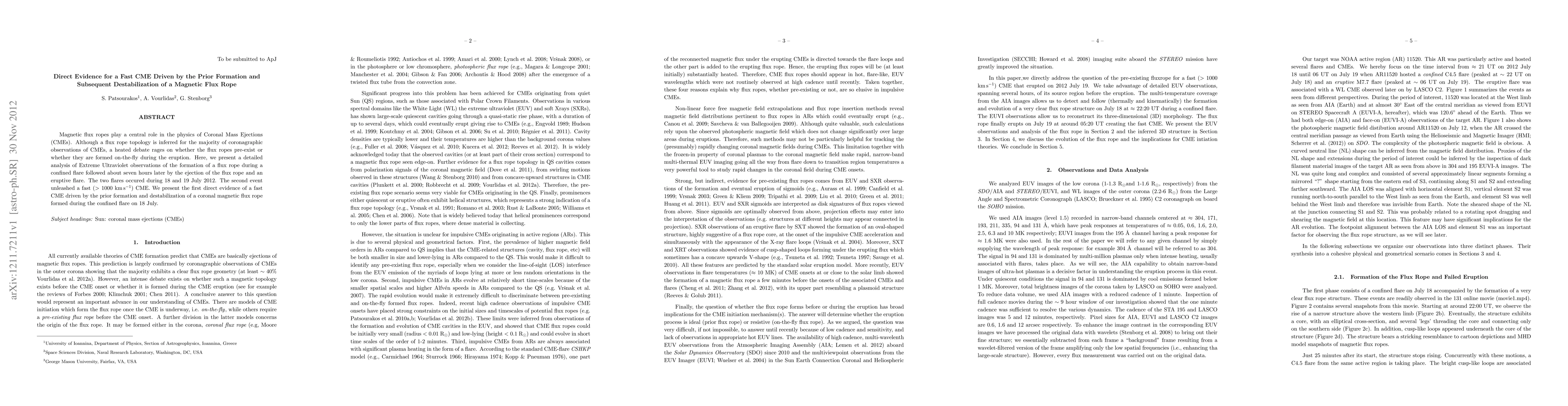 This paper provides direct evidence of a fast Coronal Mass Ejection (CME) driven by the formation and destabilization of a magnetic flux rope during a confined flare on 18 July 2012, followed by a subsequent eruptive flare and fast CME on 19 July. The study uses Extreme Ultraviolet observations to detail the process.