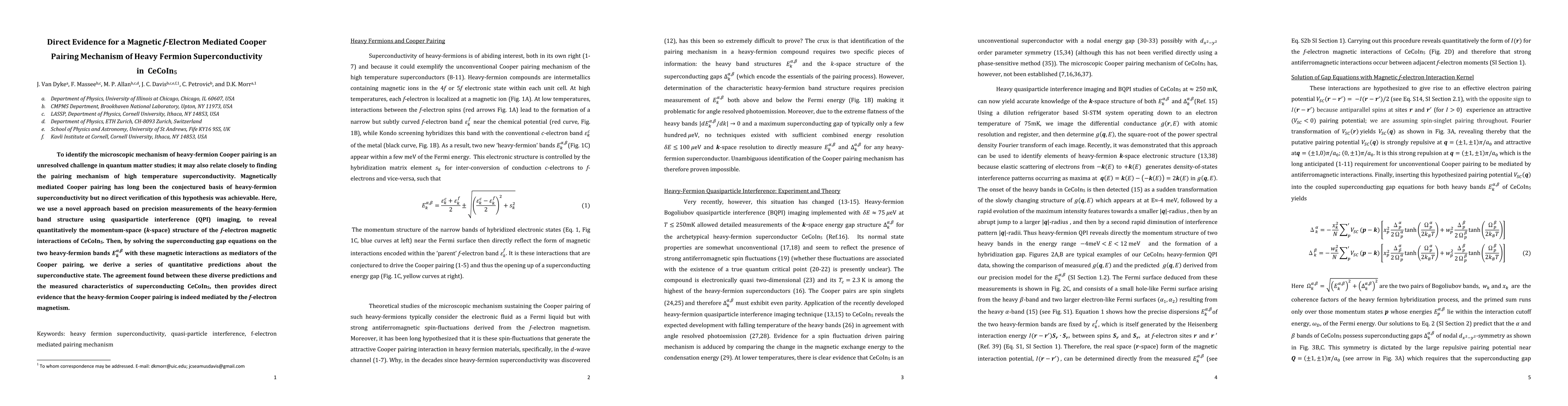 This paper provides direct evidence that f-electron magnetism mediates Cooper pairing in the heavy-fermion superconductor CeCoIn5, using precision quasiparticle interference imaging and superconducting gap equation analysis. The findings support the long-conjectured magnetic pairing mechanism in heavy-fermion superconductivity.