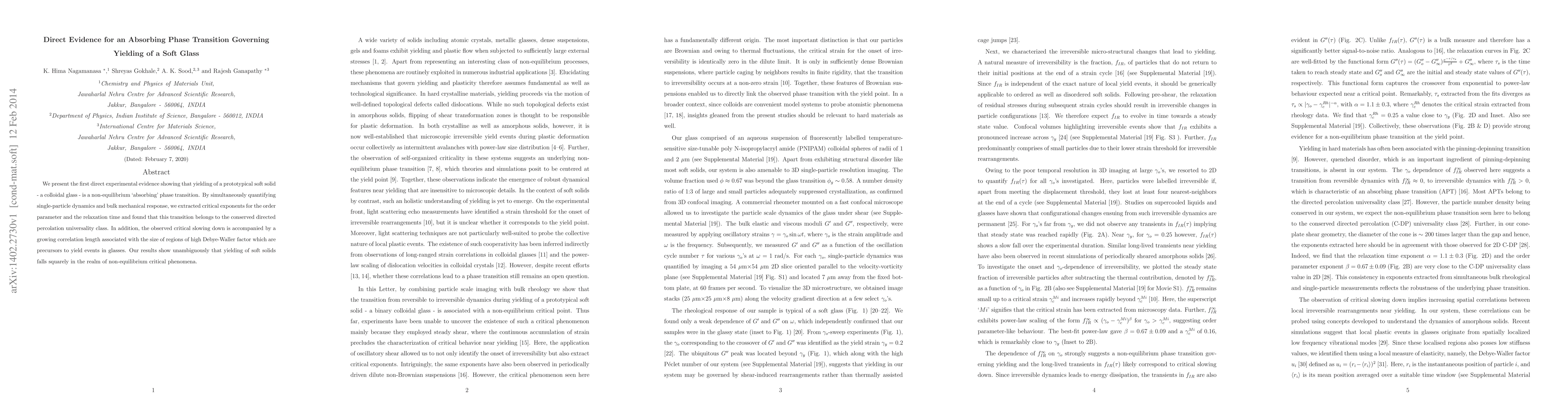 This paper provides direct experimental evidence for a non-equilibrium 'absorbing' phase transition governing the yielding of a colloidal glass, classifying it within the conserved directed percolation universality class. The study reveals critical exponents and a growing correlation length, confirming that yielding in soft solids exhibits non-equilibrium critical phenomena.