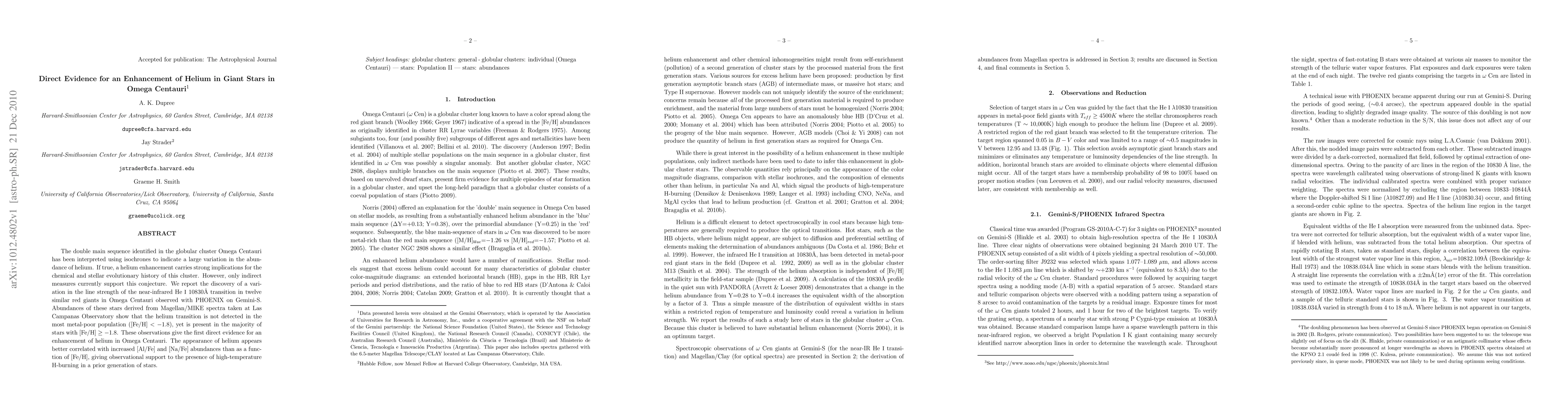 This paper reports the first direct evidence for helium enhancement in red giants within the Omega Centauri globular cluster, observed via the He I 10830 Å transition, indicating a correlation with increased [Al/Fe] and [Na/Fe], supporting high-temperature hydrogen burning in prior generations.