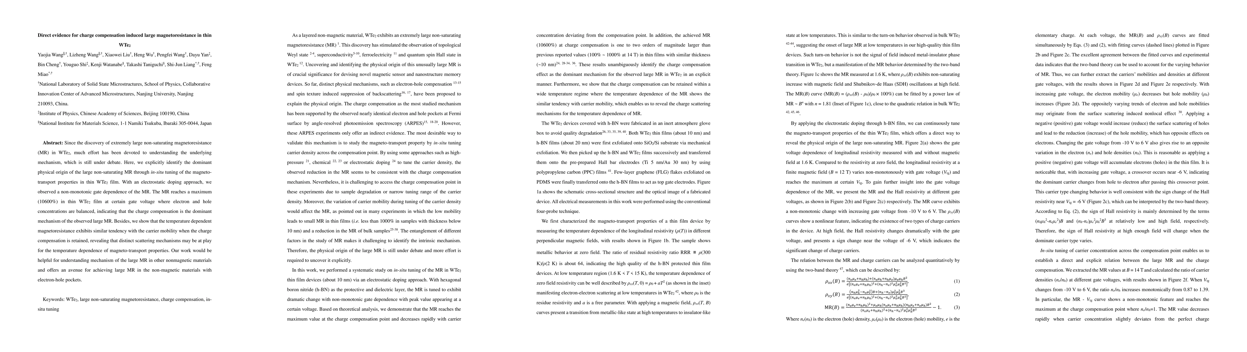 This paper identifies charge compensation as the dominant mechanism for the large magnetoresistance observed in thin WTe2 films, achieved through electrostatic doping. The study reveals that balanced electron and hole concentrations maximize magnetoresistance, suggesting distinct scattering mechanisms for its temperature dependence.