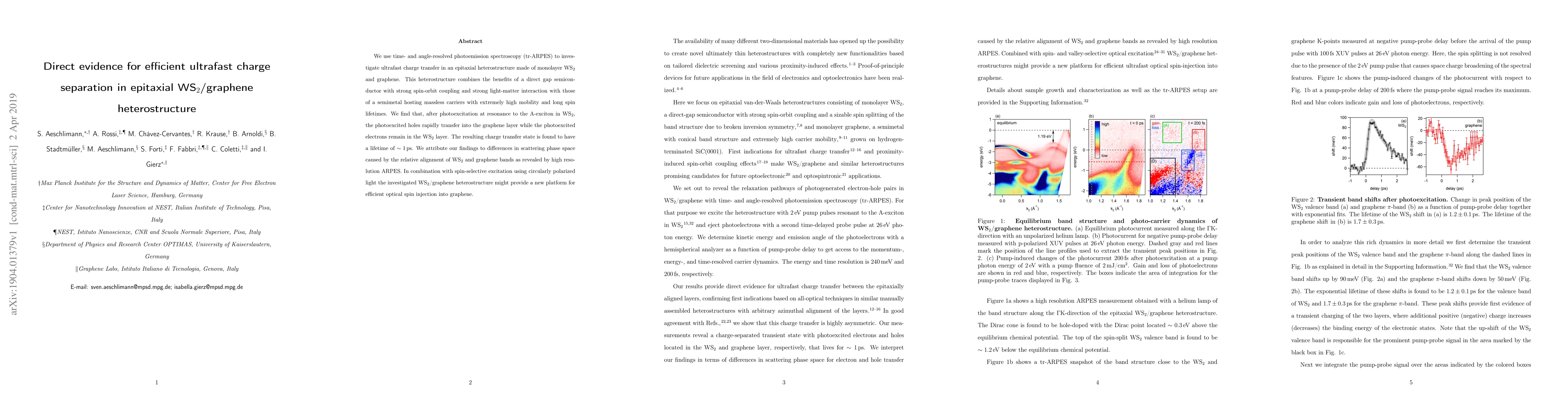 Summary: Using time- and angle-resolved photoemission spectroscopy, researchers discovered efficient ultrafast charge separation in an epitaxial WS$_2$/graphene heterostructure, where photoexcited holes transfer rapidly into graphene while electrons stay in WS$_2$, achieving a charge separation lifetime of approximately 1 ps, enabled by the unique band alignment and spin-orbit coupling of the materials.