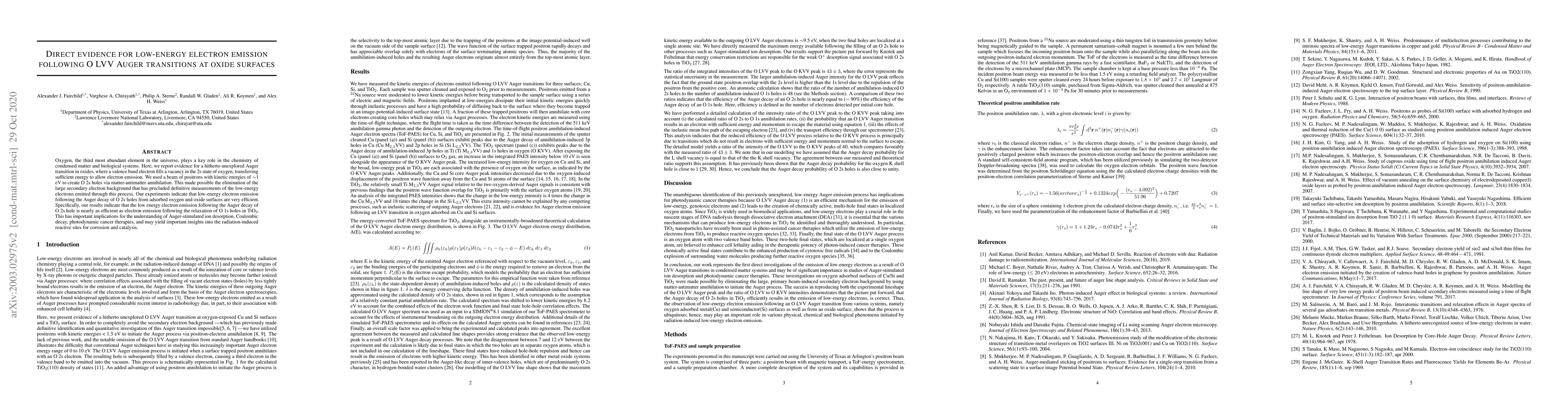 Oxygen, the third most abundant element in the universe, plays a key role in the chemistry of condensed matter and biological systems. Here, we report evidence for a hitherto unexplored Auger transition in oxides, where a valence band electron fills a vacancy in the 2s state of oxygen, transferring sufficient energy to allow electron emission. We used a beam of positrons with kinetic energies of $\sim$1 eV to create O 2s holes via matter-antimatter annihilation. This made possible the elimination of the large secondary electron background that has precluded definitive measurements of the low-energy electrons emitted through this process. Our experiments indicate that low-energy electron emission following the Auger decay of O 2s holes from adsorbed oxygen and oxide surfaces are very efficient. Specifically, our results indicate that the low energy electron emission following the Auger decay of O 2s hole is nearly as efficient as electron emission following the relaxation of O 1s holes in TiO$_2$. This has important implications for the understanding of Auger-stimulated ion desorption, Coulombic decay, photodynamic cancer therapies, and may yield important insights into the radiation-induced reactive sites for corrosion and catalysis.