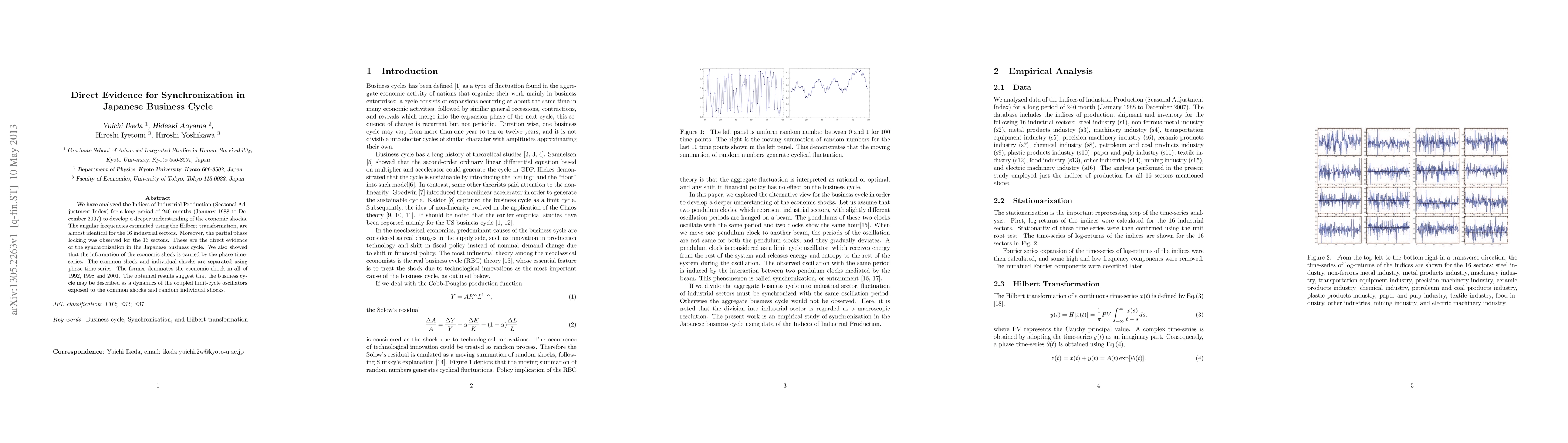 This paper provides direct evidence of synchronization in the Japanese business cycle through analysis of 240 months of Industrial Production Indices. The study reveals identical angular frequencies and partial phase locking across 16 industrial sectors, indicating synchronized business cycles driven by common and individual economic shocks.