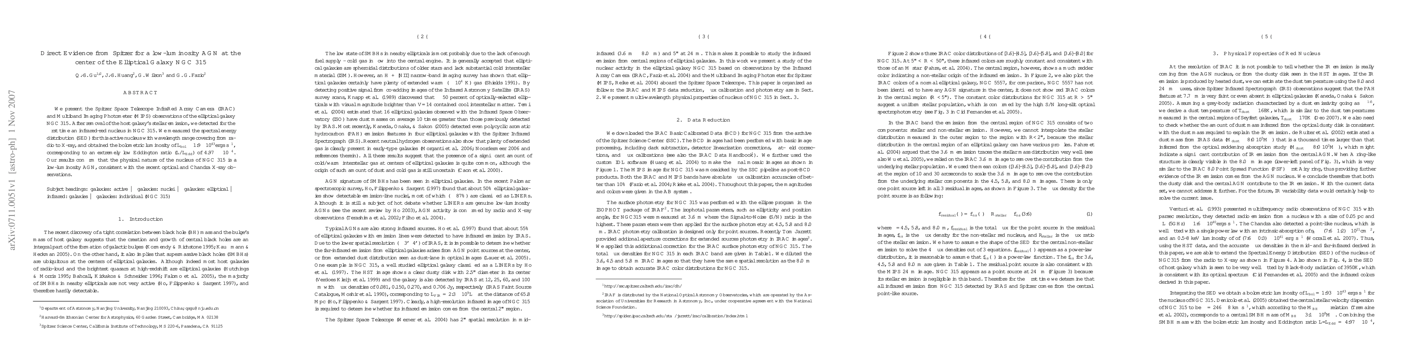 This research utilizes Spitzer Space Telescope data to reveal an infrared-red nucleus in the elliptical galaxy NGC 315, confirming it as a low-luminosity active galactic nucleus (AGN) with a bolometric luminosity of approximately 1.9 x 10^43 ergs s^-1, corresponding to an extremely low Eddington ratio (L/L_Edd) of 4.97 x 10^-4. This finding aligns with previous optical and Chandra X-ray observations.