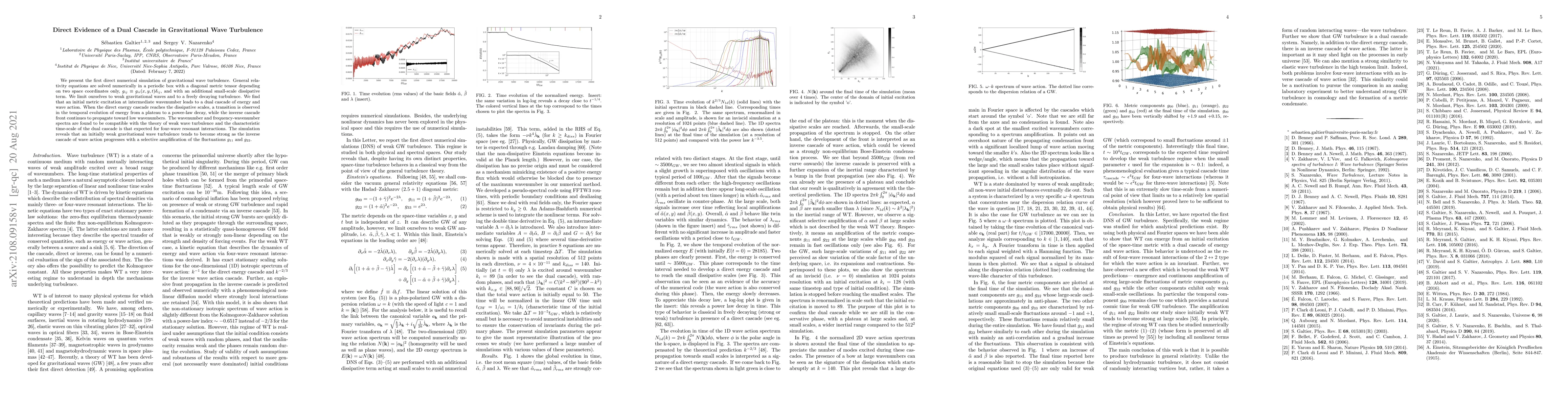 This paper presents the first direct numerical simulation of gravitational wave turbulence, revealing a dual cascade of energy and wave action. The simulation shows that weak initial gravitational waves evolve into strong turbulence, with a transition in energy decay and selective amplification of specific metric components.
