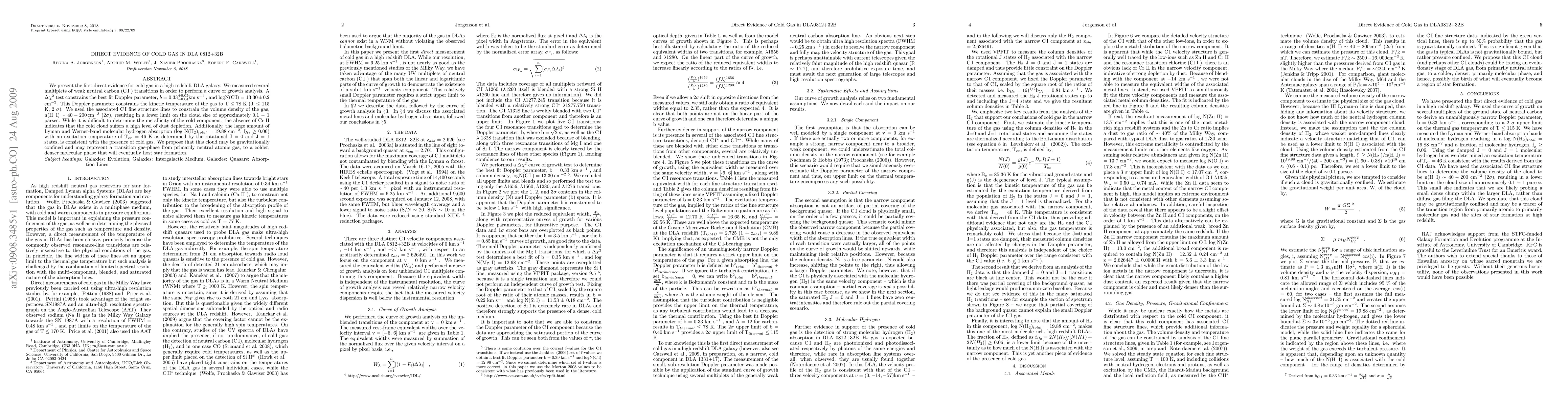We present the first direct evidence for cold gas in a high redshift DLA galaxy. We measured several multiplets of weak neutral carbon (CI) transitions in order to perform a curve of growth analysis. A delta chi-squared test constrains the best fit Doppler parameter, b = 0.33_{-0.04}^{+0.05} km/s, and logN(CI) = 13.30 +- 0.2 cm^-2. This Doppler parameter constrains the kinetic temperature of the gas to T <= 78 K (T <= 115 K, 2 sigma). We used the associated CI fine structure lines to constrain the volume density of the gas, n(HI) ~ 40 - 200 cm^-3 (2 sigma), resulting in a lower limit on the cloud size of approximately 0.1 - 1 parsec. While it is difficult to determine the metallicity of the cold component, the absence of Cr II indicates that the cold cloud suffers a high level of dust depletion. Additionally, the large amount of Lyman and Werner-band molecular hydrogen absorption (log N(H2)_{total} = 19.88 cm^-2, f_{H_2} >= 0.06) with an excitation temperature of T_{ex} = 46 K as determined by the rotational J = 0 and J = 1 states, is consistent with the presence of cold gas. We propose that this cloud may be gravitationally confined and may represent a transition gas-phase from primarily neutral atomic gas, to a colder, denser molecular phase that will eventually host star formation.