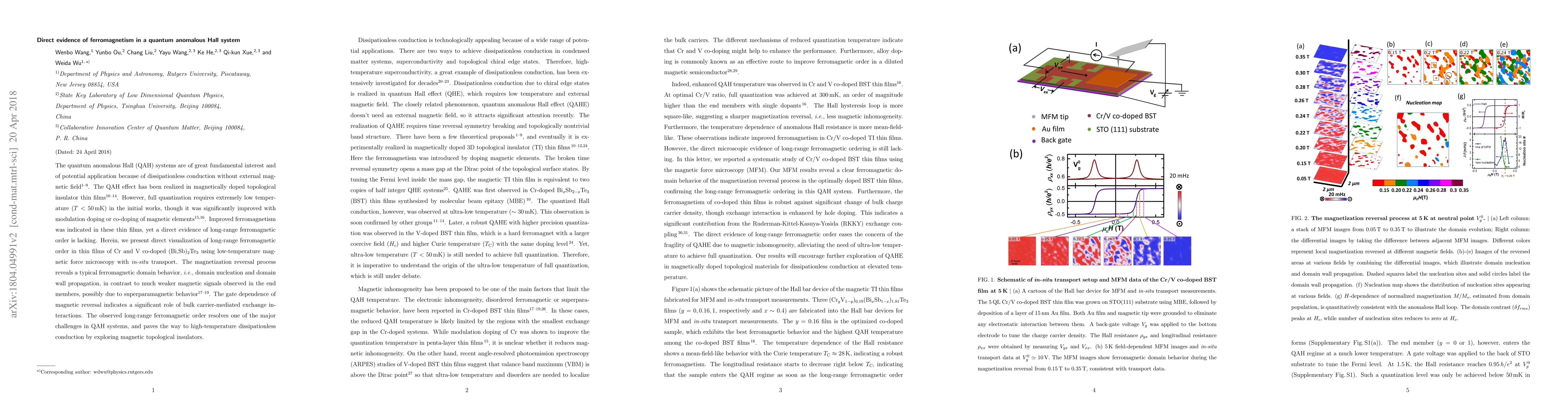 Quantum anomalous Hall (QAH) systems are of great fundamental interest and potential application because of their dissipationless conduction without the need for external magnetic field. The QAH effect has been realized in magnetically doped topological insulator thin films. However, full quantization requires extremely low temperature ($T< 50\,$mK) in the initial works, though it has been significantly improved with modulation doping or co-doping of magnetic elements. Improved ferromagnetism has been shown in these thin films, yet direct evidence of long-range ferromagnetic order is lacking. Herein, we present direct visualization of long-range ferromagnetic order in thin films of Cr and V co-doped (Bi,Sb)$_2$Te$_3$ using low-temperature magnetic force microscopy with $\textit{in-situ}$ transport. The magnetization reversal process reveals typical ferromagnetic domain behavior, i.e., domain nucleation and possibly domain wall propagation, in contrast to much weaker magnetic signals observed in the end members, possibly due to superparamagnetic behavior. The observed long-range ferromagnetic order resolves one of the major challenges in QAH systems, and paves the way to high-temperature dissipationless conduction by exploring magnetic topological insulators.