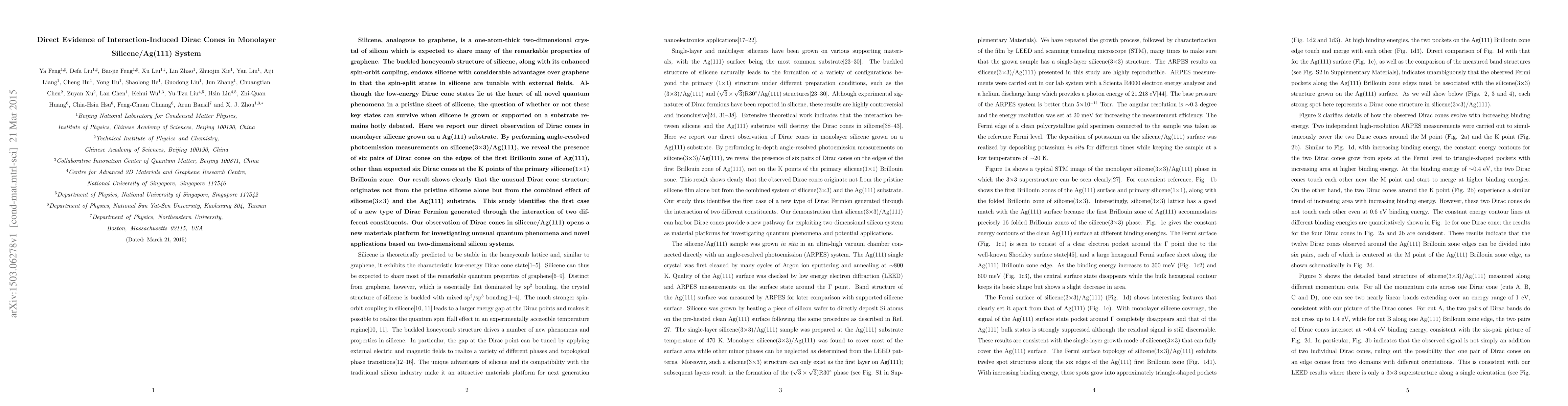 This research provides direct evidence of interaction-induced Dirac cones in monolayer silicene grown on Ag(111), revealing six pairs of Dirac cones on the edges of the first Brillouin zone, demonstrating that the Dirac cone structure arises from the combined effect of silicene and the substrate, thus opening new avenues for exploring quantum phenomena in two-dimensional silicon systems.